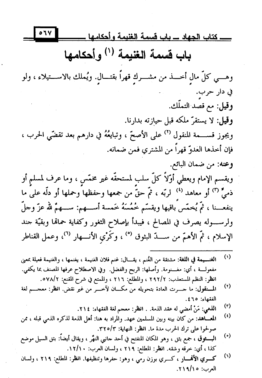 ويقسم الإمام ويعطي أولًا كل سلبٍ لمستحقه غير مخمسٍ، وما عرف لمسلمٍ أو ذميٍ أو معاهد لربه، ثم حق من جمعها وحفظها وحملها أو دله على ما ينفعنا، ثم يخمس باقيها ويقسم خمسه خمسة أسهم: سهم لله عز وجل ولرسوله يصرف في المصالح، فيبدأ بإصلاح الثغور وكفاية حمايتها وبقية جند الإسلام، ثم الأهم من سد البثوق، وكري الأنهار، وعمل القناطر