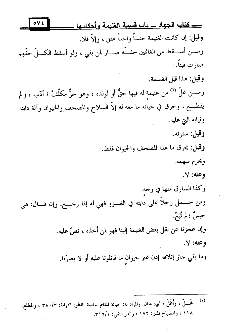 ومن غل من غنيمة له فيها حق أو لولده، وهو حر مكلف؛ أدب، ولم يقطع، وحرق في حياته ما معه له إلا السلاح والمصحف والحيوان وآلة دابته وثيابه التي عليه.