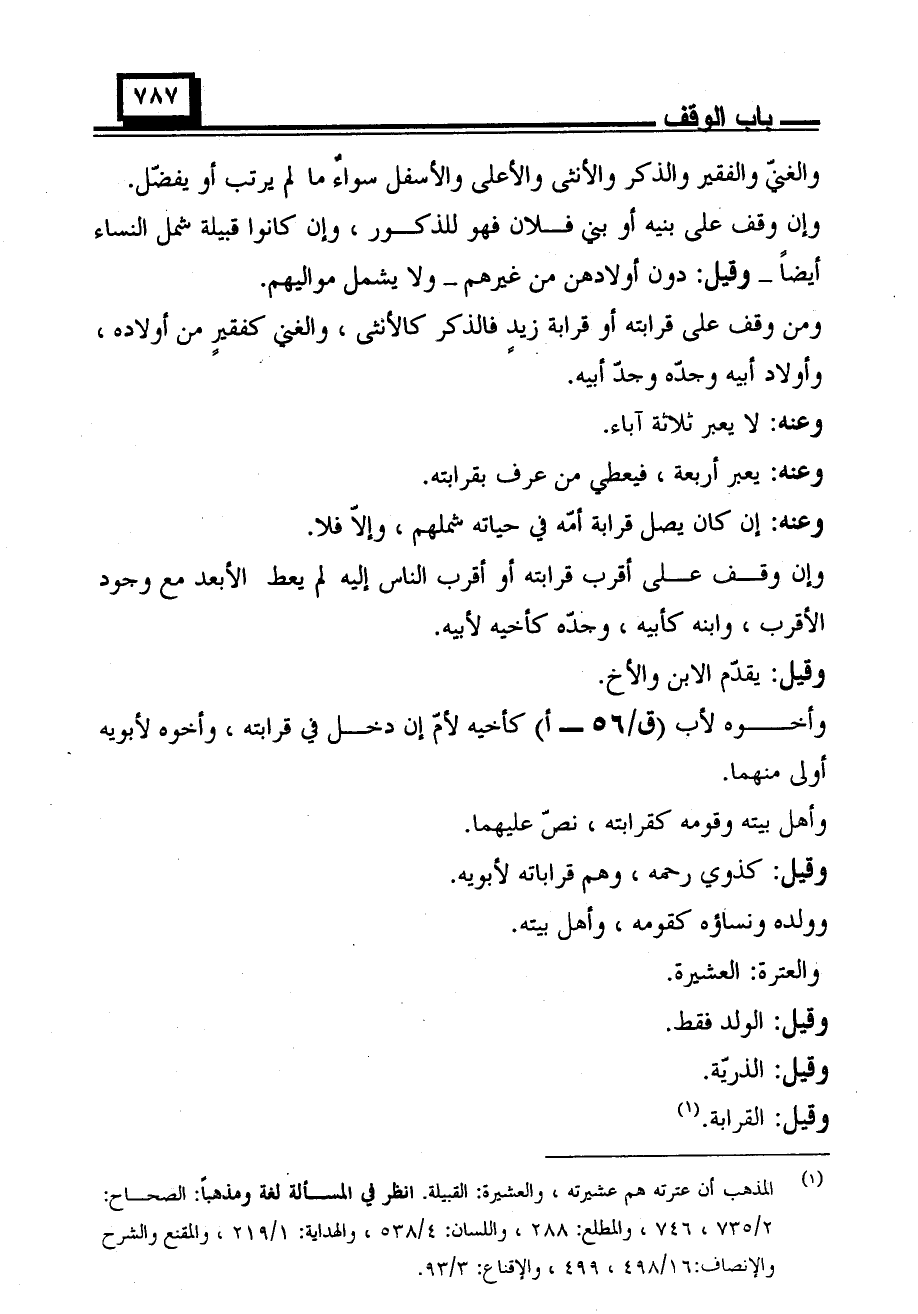 ومن وقف على قرابته أو قرابة زيد فالذكر كالأنثى، والغني كفقير من أولاده، وأولاد أبيه وجدّه وجدّ أبيه.
