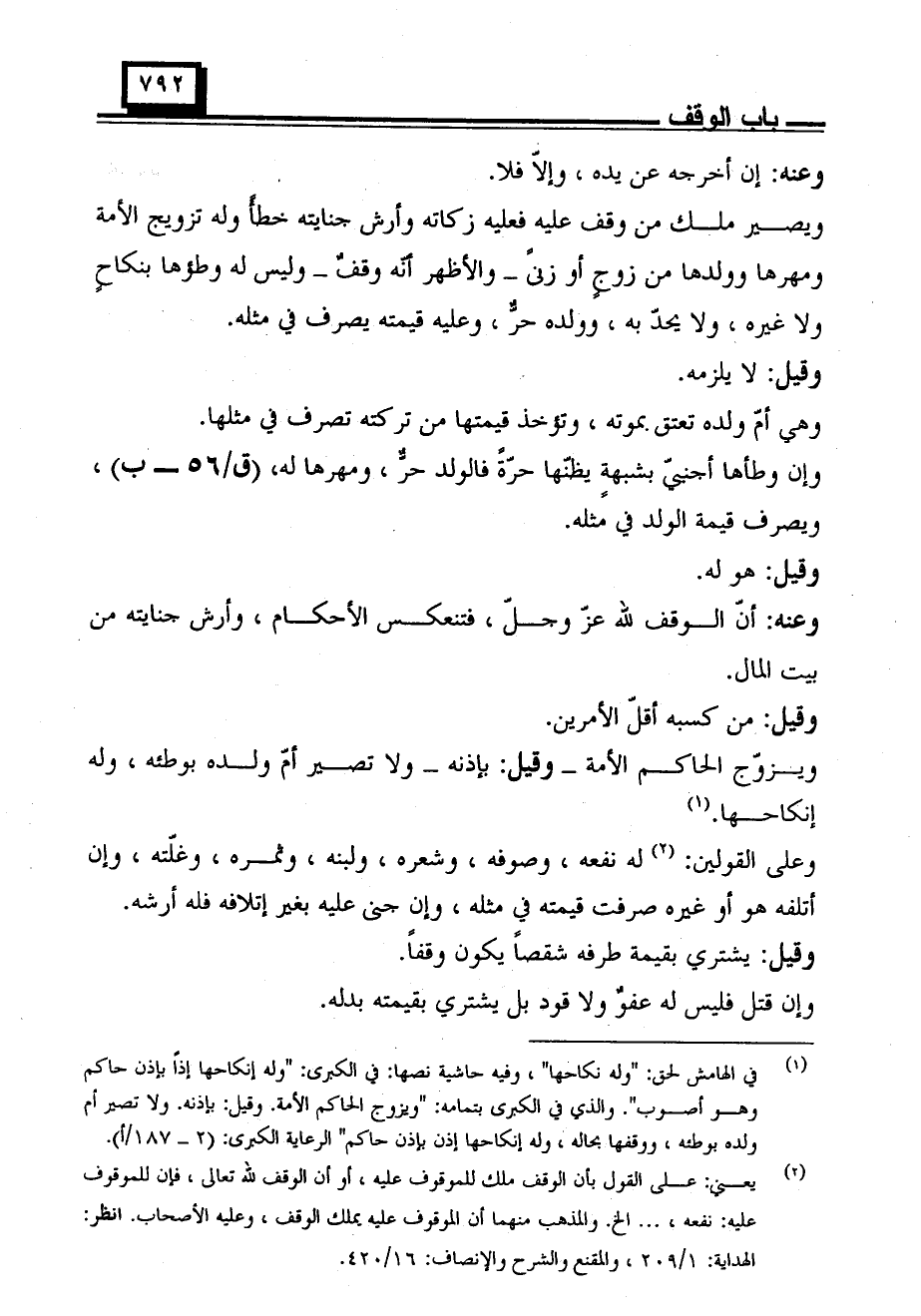 ويصير ملك من وقف عليه فعليه زكاته وأرش جنايته خطأً وله تزويج الأمة ومهرها وولدها من زوجٍ أو زنىً -والأظهر أنه وقفٌ- وليس له وطؤها بنكاحٍ ولا غيره، ولا يحدّ به، وولده حرٌّ، وعليه قيمته يصرف في مثله.