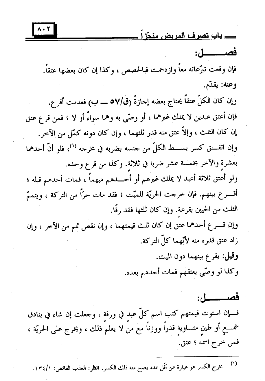 فإن أعتق عبدين لا يملك غيرهما، أو وصّى به وهما سواءٌ أو لا؛ فمن قرع عتق إن كان الثلث، وإلا عتق منه قدر ثلثهما، وإن كان دونه كمّل من الآخر.