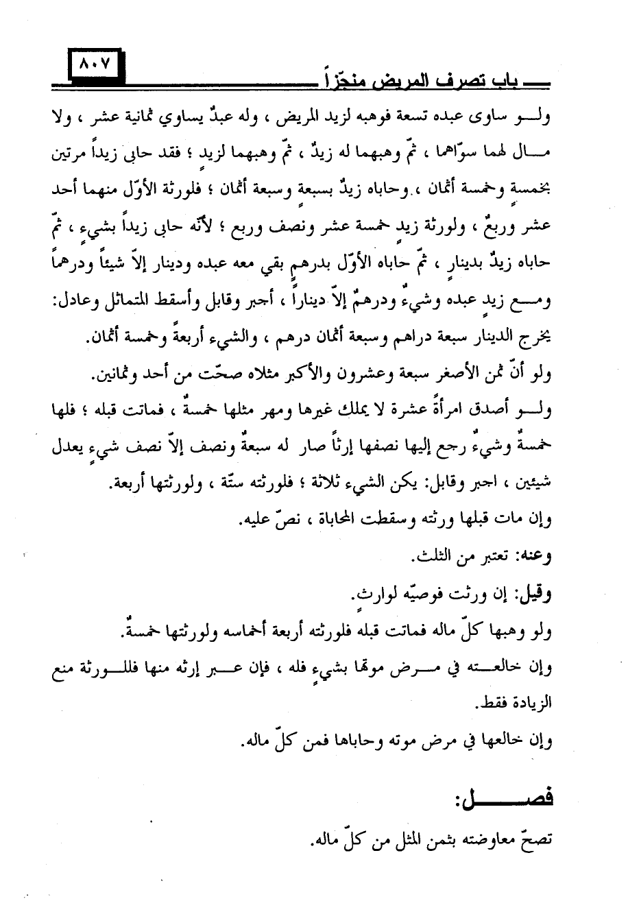 ولو ساوى عبده تسعة فوهبه لزيد المريض، وله عبدٌ يساوي ثمانية عشر، ولا مال لهما سوّاهما، ثم وهبهما له زيدٌ، ثم وهبهما لزيدٍ؛ فقد حابى زيدًا مرتين بخمسة وخمسة أثمان، وحاباه زيد بسبعة وسبعة أثمان؛ فلورثة الأول منهما أحد عشر وربع، ولورثة زيد خمسة عشر ونصف وربع؛ لأنه حابى زيدًا بشيءٍ، ثم حاباه زيد بدينار، ثم حاباه الأول بدرهم بقى معه عبده ودينار إلا شيئًا ودرهمًا ومع زيد عبده وشيء ودرهم إلا دينارًا، أجبر وقابل وأسقط المتماثل وعادل: يخرج الدينار سبعة دراهم وسبعة أثمان درهم، والشيء أربعة وخمسة أثمان.
