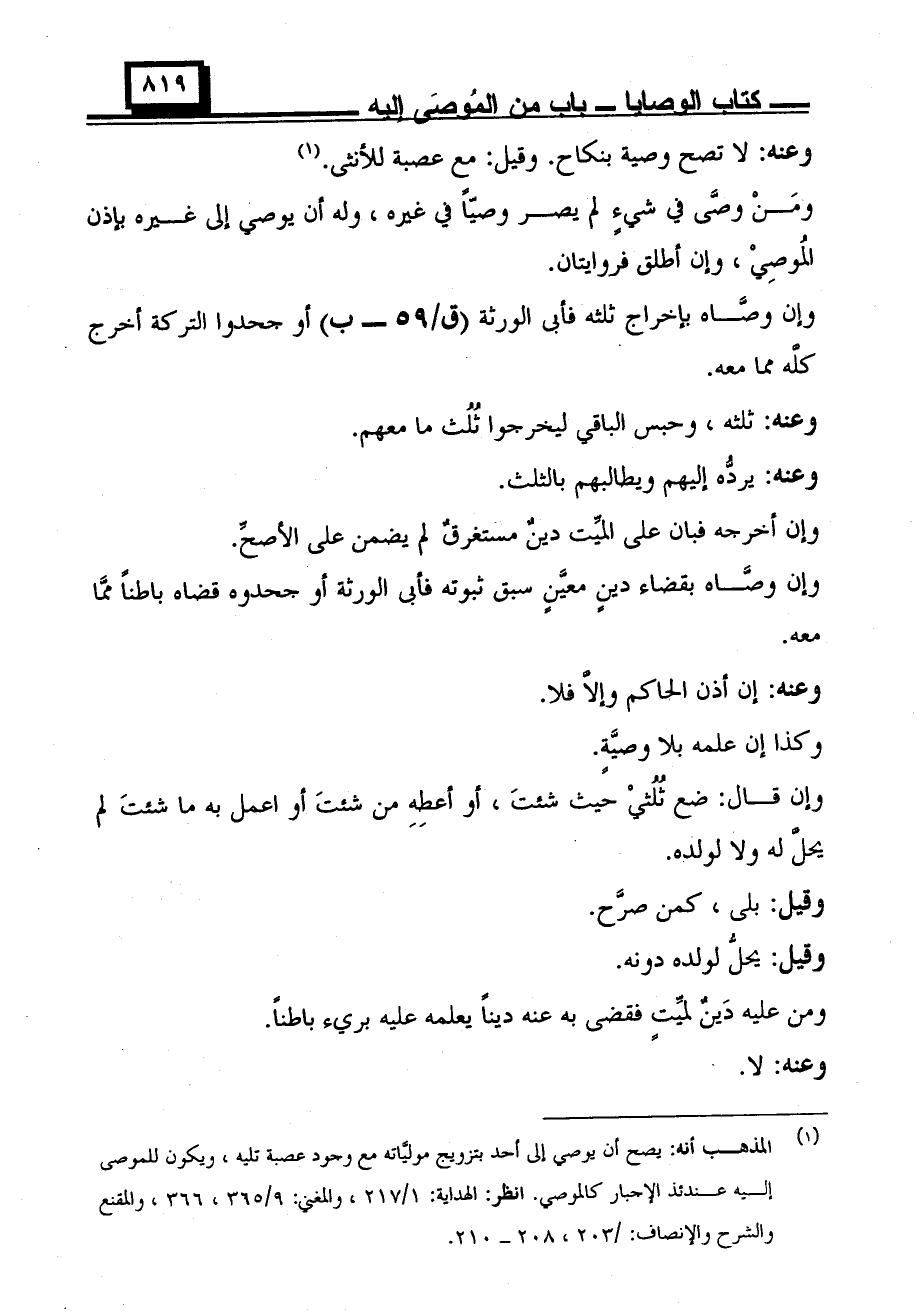 ومن وصَّى في شيء لم يصر وصيًّا في غيره، وله أن يوصي إلى غيره بإذن الموصِي، وإن أطلق فروايتان.
