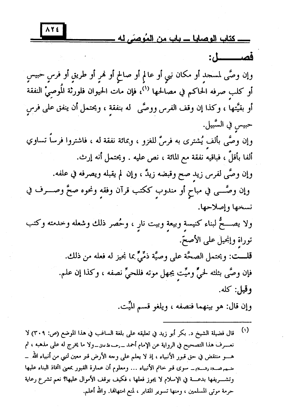 وإن وصَّى لمسجد أو مكان نبي أو عالم أو صالح أو نهر أو طريق أو فرس حبيس أو كلب صرفه الحاكم في مصالحها، فإن مات الحيوان فلورثة الموصي النفقة أو بقيتها، وكذا إن وقف الفرس ووصى له بنفقة، ويحتمل أن ينفق على فرس حبيس في السبيل.