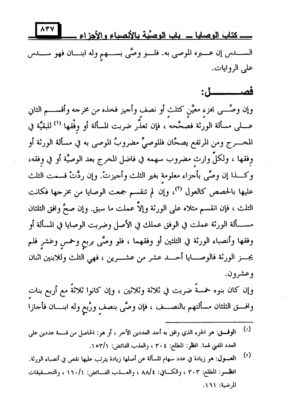 وإن وصى بجزء معين كثلث أو نصف وأجيز فخذه من مخرجه وأقسم الثاني على مسألة الورثة فصحَّحه، فإن تعذَّر ضربت المسألة أو وِفْقها للبقية في المخرج ومن المرتفع يصحان فللوصيّ مضروبُ الموصى به في مسألة الورثة أو وِفقها، ولكل وارث مضروب سهمه في فاضل المخرج بعد الوصية أو في وفقه، وكذا إن وصى بأجزاء غير معلومة بغير الثلث وأجيزتْ. وإن ردَّت قسمت الثلث عليها بالحصول كالعول، وإن لم تنقسم جمعت الوصايا من مخرجها فكانت الثلث، فإن انقسم مثلاه على الورثة وإلّا عملت ما سبق. وإن صح وافق الثلثان مسألة الورثة عملت في الوفق عملك في الأصل وضربت الوصايا في المسألة أو وفقها وأنصباء الورثة في الثلثين أو فقهما، فلو وصى بربع وخمس وعشر فلم يجز الورثة فالوصايا أحد عشر من عشرين، فهي الثلث وللابنين اثنان وعشرون.