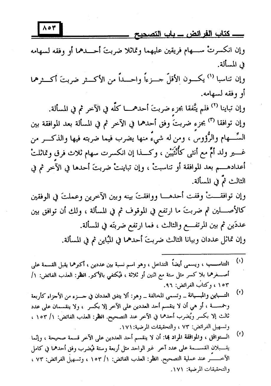 وإن تناسبا يكون الأقل جزءًا واحدًا من الأكثر ضربت أكثرهما أو وفقه لسهامه.