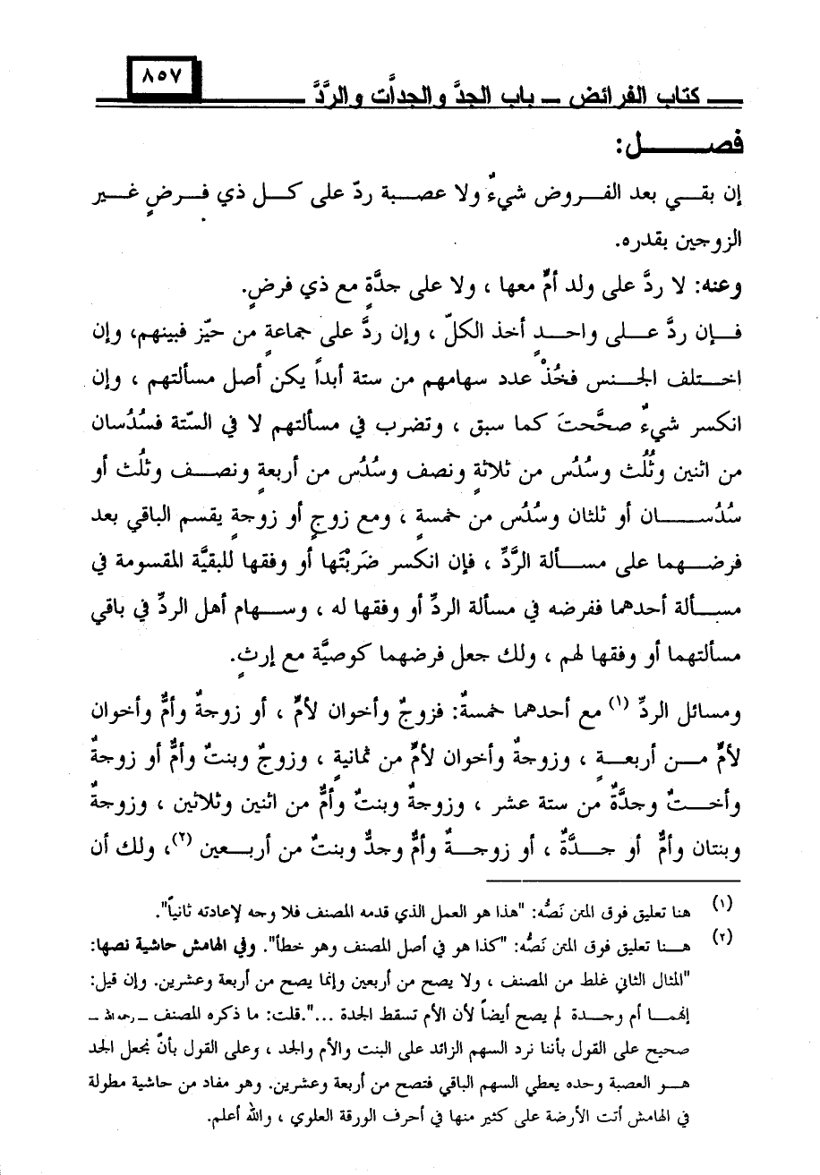 ومسائل الرد مع أحدهما خمسة: فزوج وأخوان لأمٍّ، أو زوجة وأمٌّ وأخوان لأمٍّ من أربعة، وزوجة وأخوان لأمٍّ من ثمانية، وزوج وبنتٌ وأمٌّ أو زوجةٌ وأختٌ وجدّةٌ من ستة عشر، وزوجة وبنت وأمٌّ من اثنين وثلاثين، وزوجةٌ وبنتان وأمٌّ أو جدّةٌ، أو زوجةٌ وأمٌّ وجدُّ وبنتٌ من أربعين، ولك أن