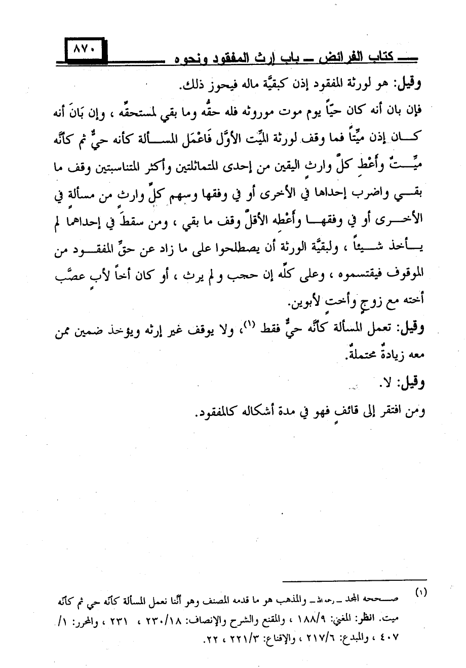 فإن بان أنه كان حيًّا يوم موت موروثه فله حقه وما بقي لمستحقه، وإن بان أنه كان إذن ميتا فما وقف لورثة الميت الأول فاعمل المسألة كأنه حي ثم كأنه ميت وأعطِ كل وارث اليقين من إحدى المتماثلتين وأكثر المتناسبتين وقف ما بقي واضرب إحداهما في الأخرى أو في وفقها وسهم كل وارث من مسألة في الأخرى أو في وفقها وأعطِه الأقل وقف ما بقي، ومن سقط في إحداهما لم يأخذ شيئًا، ولبقية الورثة أن يصطلحوا على ما زاد عن حق المفقود من الموقوف فيقتسموه، وعلى كله إن حجب ولم يرث، أو كان أخا لأب عصَّب أخته من زوجٍ وأختٍ لأبوين.