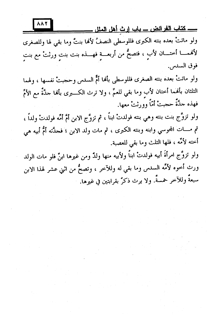 ولو تزوّج بنت بنته وهي بنته فولدتْ ابنًا، ثم تزوج الابن أمَّ أمِّه فولدتْ ولدًا، ثم مات المجوسي وابنه وبنته الكبرى، ثم مات ولد الابن؛ فجدّته أمُّ أبيه هي أخته لأمِّه، فلها الثلث وما بقي للعصبة.