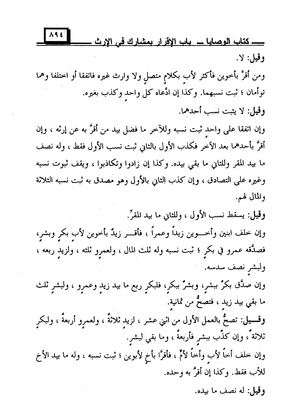 وقيل: تصح بالعمل الأول من اثني عشر، لزيد ثلاثة، ولعمرو أربعة، ولبكر ثلاثة، وإن كذب ببشر فأربعة، وما بقي لبشر.