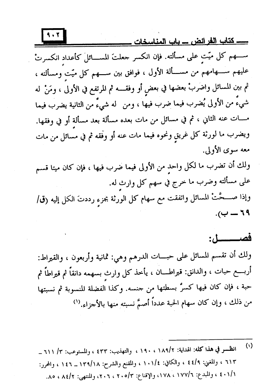 سهم كل ميت على مسألته. فإن انكسر جعلت المسائل كأعداد انكسرت عليهم سهامهم من مسألة الأول، فوافق بين سهم كل ميت ومسألته، ثم بين المسائل واضرب بعضها في بعض أو وفقه ثم المرتفع في الأولى، ومن له شيء من الأولى يُضرب فيما ضرب فيها، ومن له شيء من الثانية يضرب فيما مات عنه الثاني، ثم في مسائل من مات بعده مسألة بعد مسألة أو في وفقها. ويضرب ما لورثة كل غريق ونحوه فيما مات عنه أو وفقه ثم في مسائل من مات معه سوى الأولى.