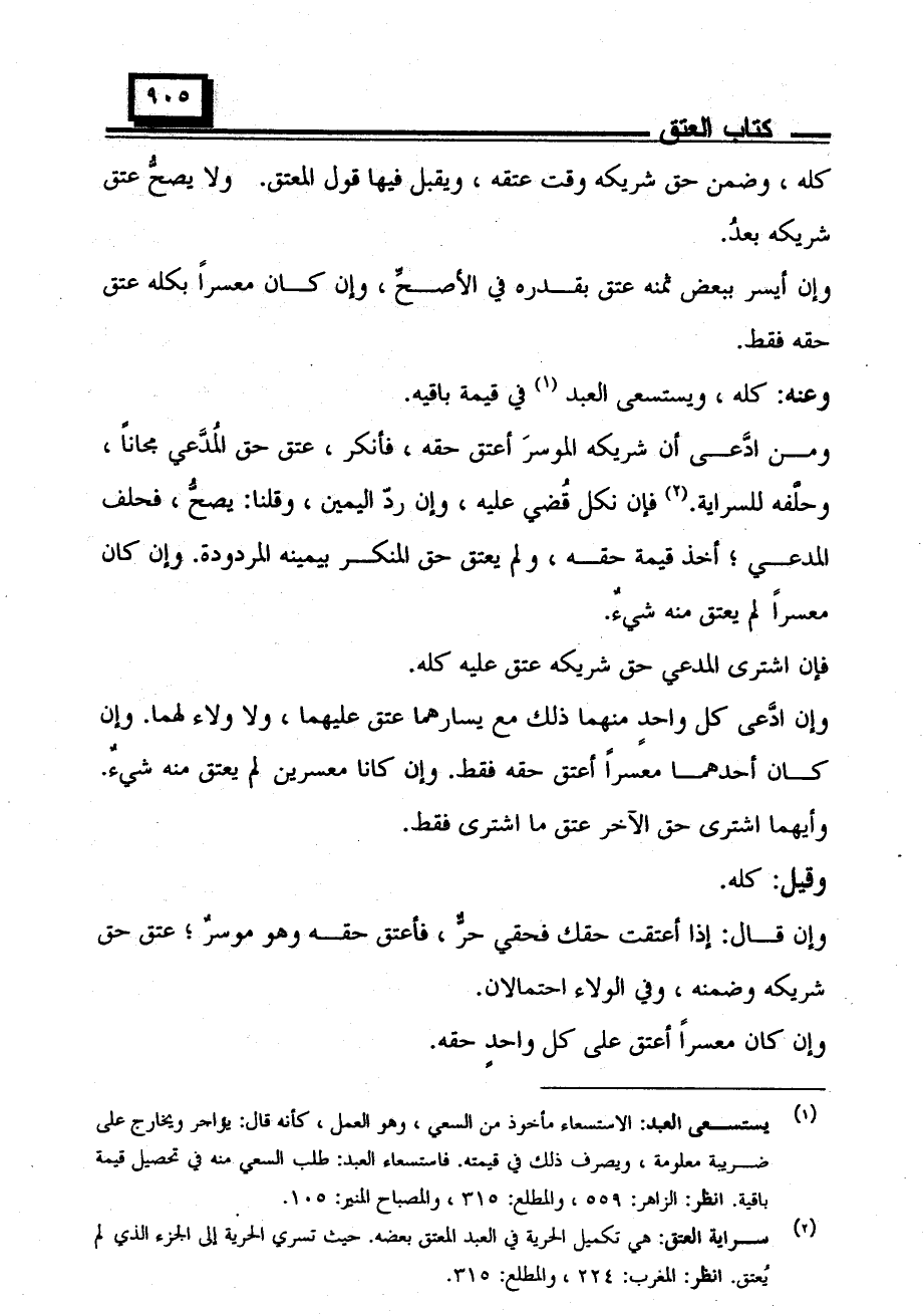ومن ادّعى أن شريكه الموسر أعتق حقه، فأنكر، عتق حق المُدَّعى مجانًا، وحلّفه للسراية. فإن نكل قُضي عليه، وإن ردّ اليمين، وقلنا، يصح، فحلف المدعي؛ أخذ قيمة حقه، ولم يعتق حق المنكر بيمينه المردودة. وإن كان معسرًا لم يعتق منه شيء.