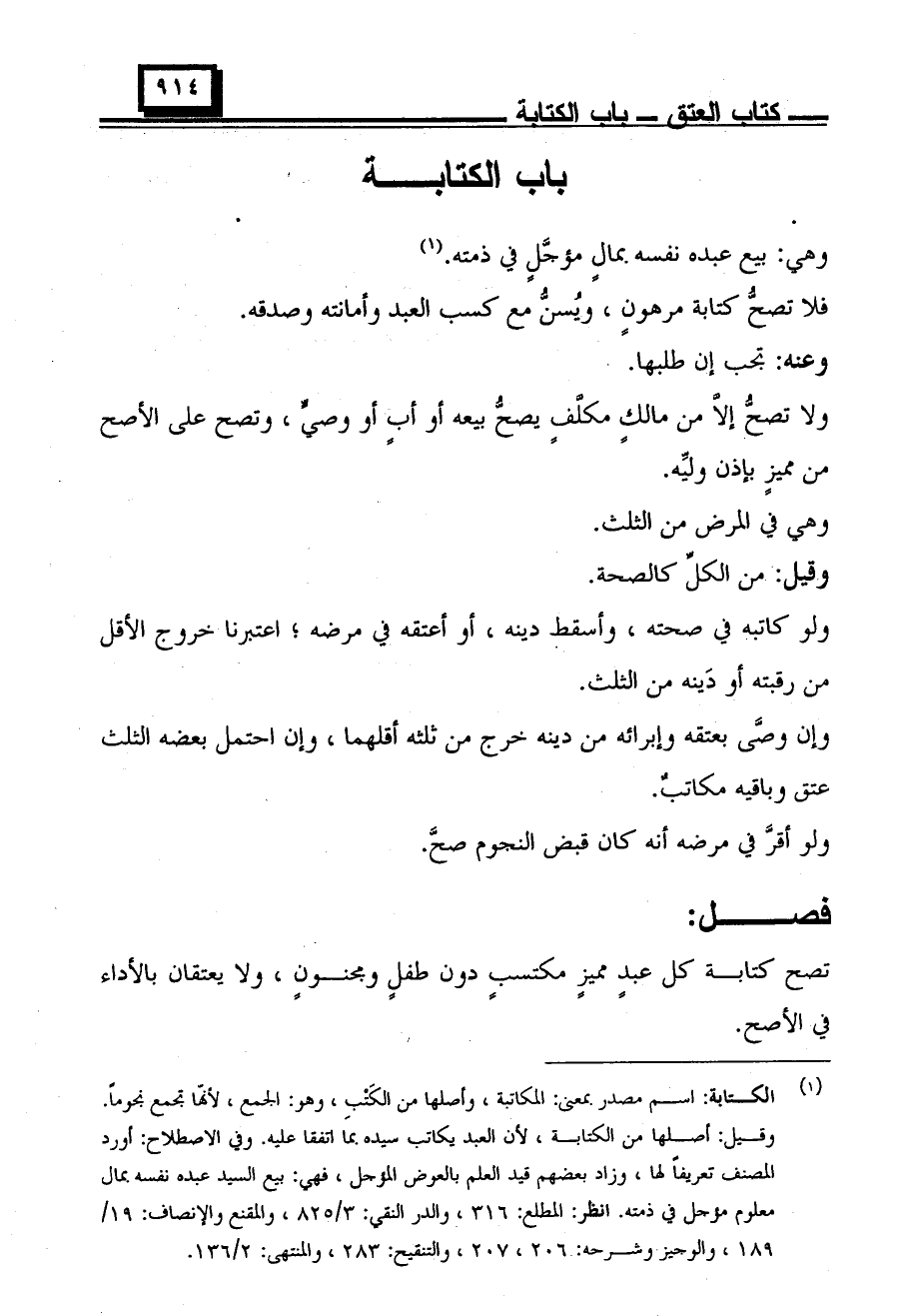 تصح كتابة كل عبدٍ مميز مكتسب دون طفل أو مجنون، ولا يعتقان بالأداء في الأصح.