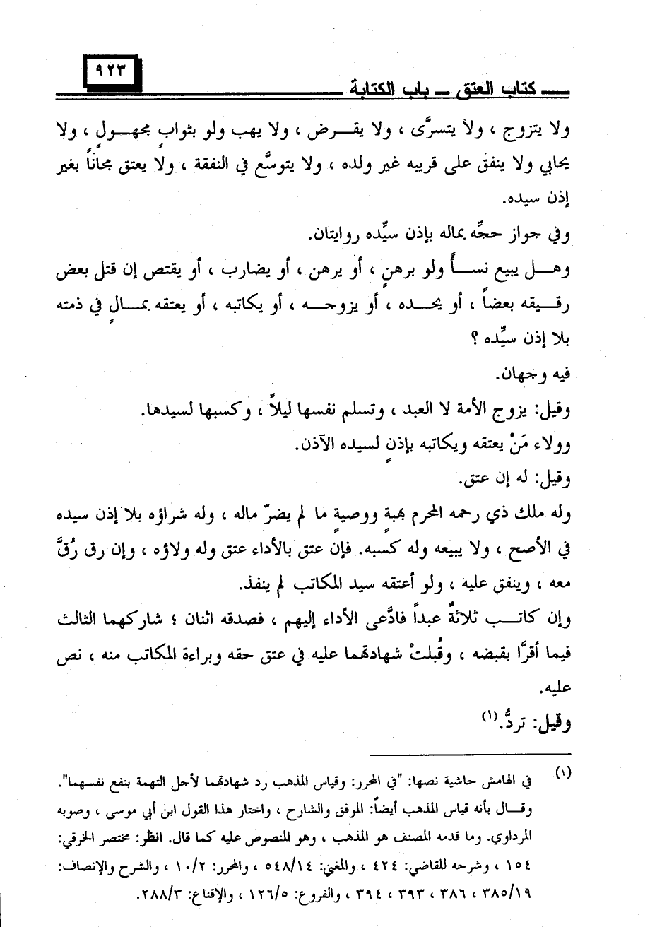 وهل يبيع نسأ ولو برهنٍ، أو يرهن، أو يضارب، أو يقتص إن قتل بعض رقيقه بعضًا، أو يحده، أو يزوجه، أو يكاتبه، أو يعتقه بمالٍ في ذمته بلا إذن سيده؟