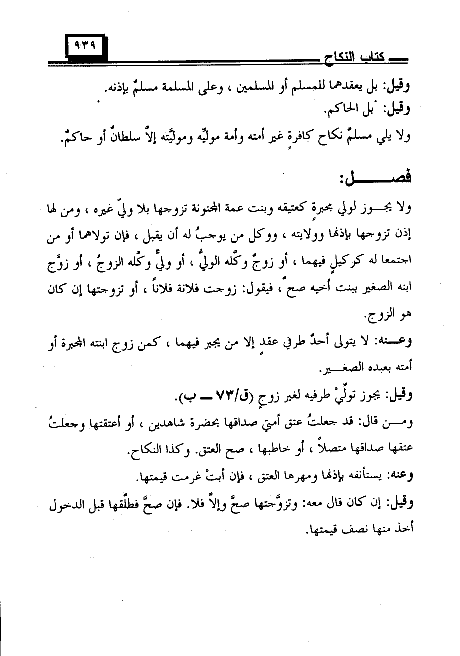 وقيل: بل يعقدهما للمسلم أو المسلمين، وعلى المسلمة مسلم بإذنه.