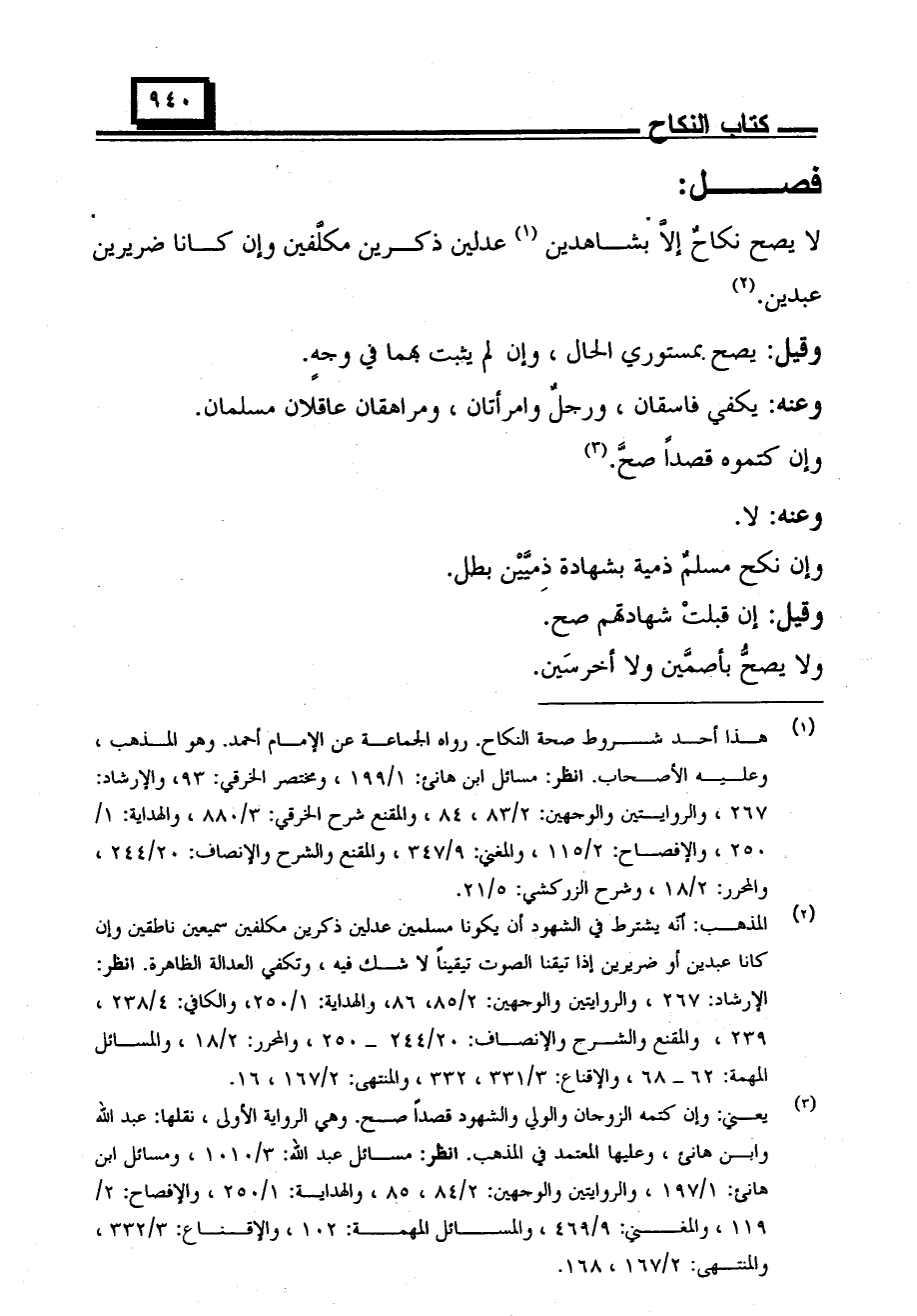 لا يصح نكاح إلا بشاهدين عدلين ذكرين مكلفين وإن كانا ضريرين عبدين.