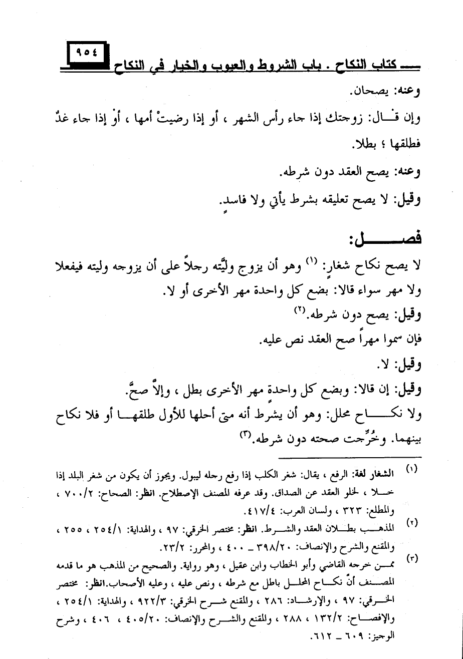 لا يصح نكاح شغارٍ: وهو أن يزوج وليّته رجلًا على أن يزوجه وليته فيفعلا ولا مهر سواء قالا: بضع كل واحدة مهر الأخرى أو لا.