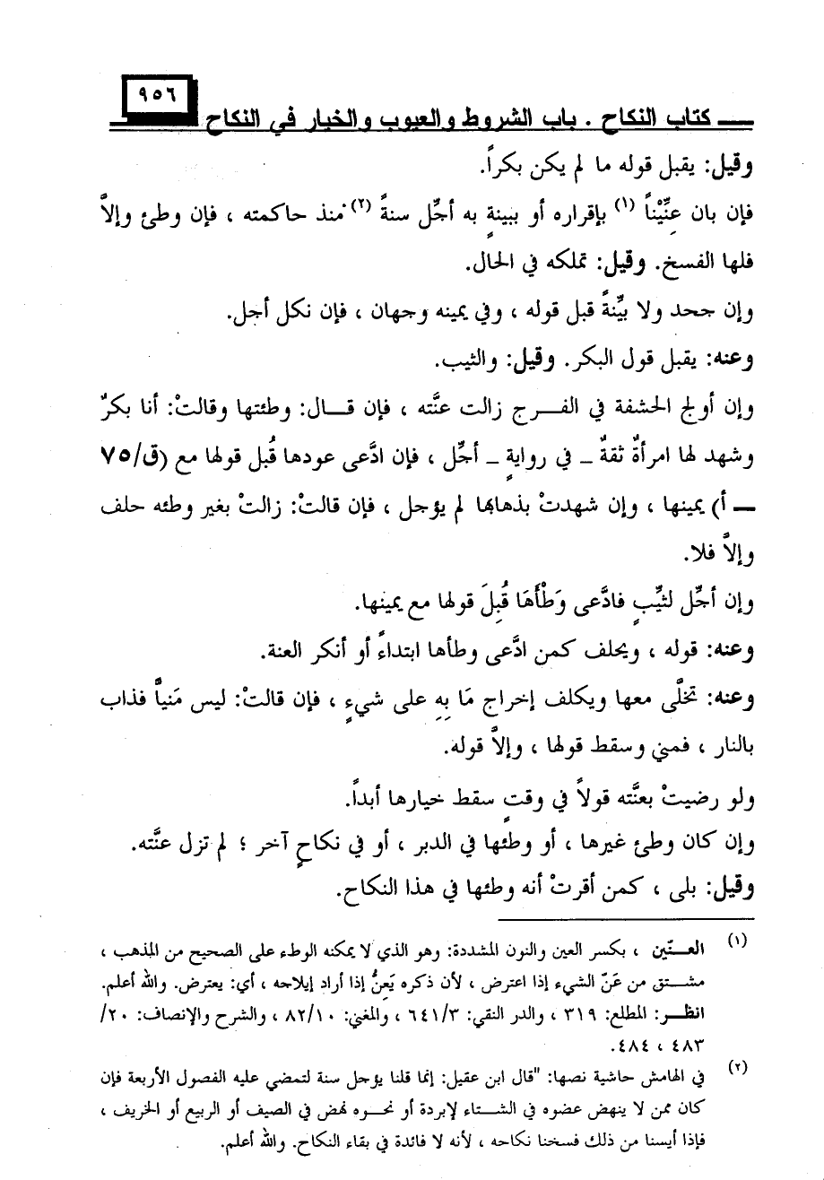 وإن أولج الحشفة في الفرج زالت عنّته، فإن قال: وطئتها وقالتْ: أنا بكرٌ وشهد لها امرأة ثقة _في رواية_ أجِّل، فإن ادّعى عودها قُبل قولها مع يمينها، وإن شهدتْ بذهابها لم يؤجل، فإن قالتْ: زالتْ بغير وطئه حلف وإلا فلا.