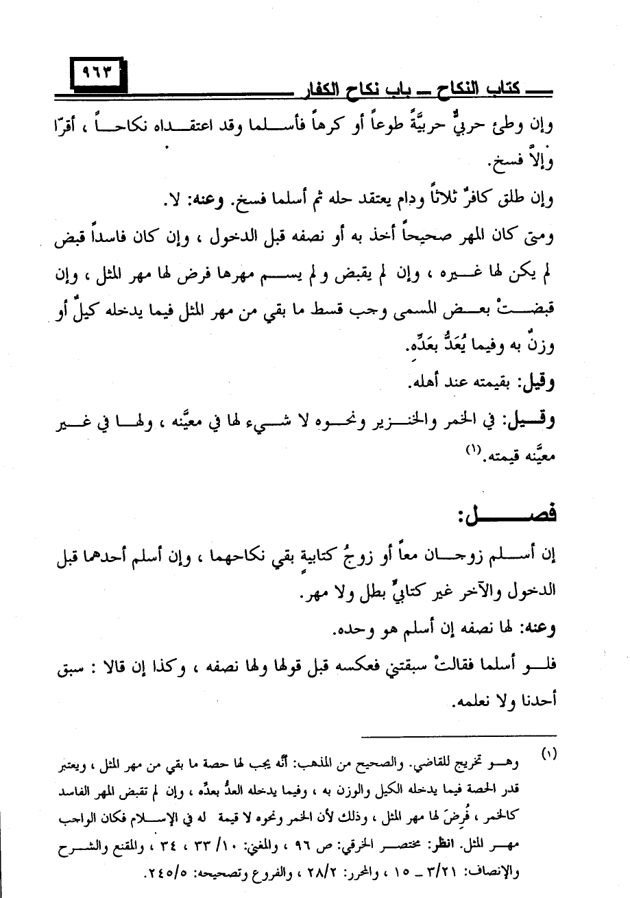 إن أسلم زوجان معًا أو زوجُ كتابية بقي نكاحهما، وإن أسلم أحدهما قبل الدخول والآخر غير كتابيٍّ بطل ولا مهر.