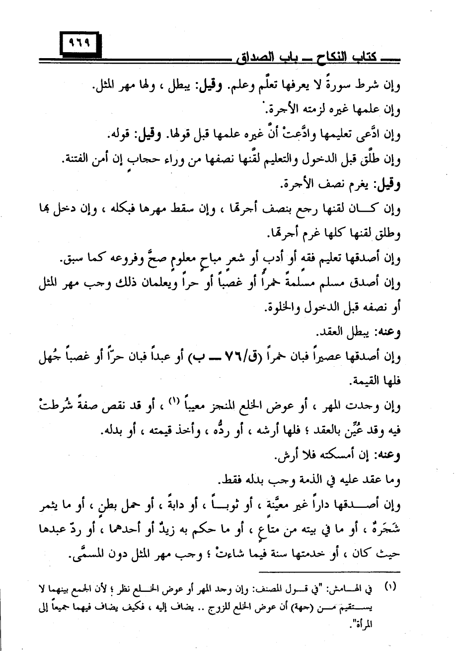 وإن أصدق مسلم مسلمة خمرًا أو غصبًا أو حرًا ويعلمنا ذلك وجب مهر المثل أو نصفه قبل الدخول والخلوة.