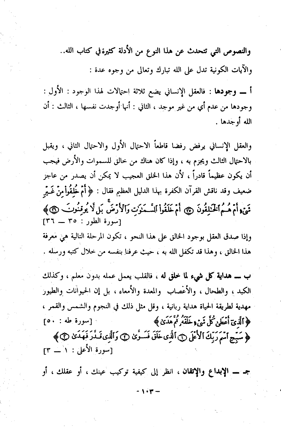 أ- وجودها: فالعقل الإنساني يضع ثلاثة احتمالات لهذا الوجود: الأول: وجودها من عدم أي من غير موجد، الثاني: أنها أوجدت نفسها، الثالث: أن الله أوجدها.