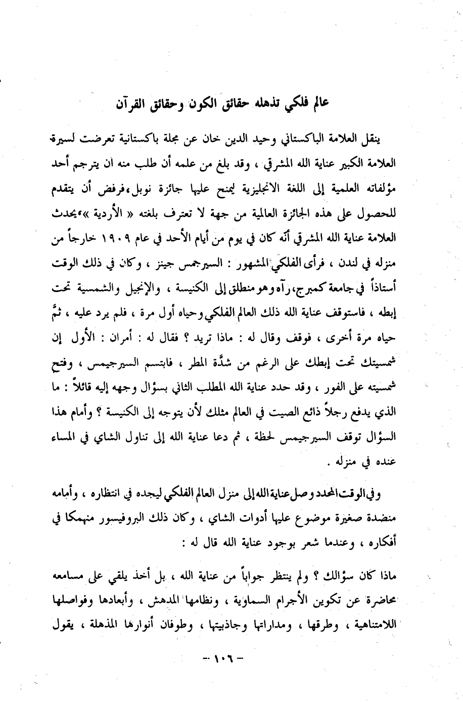 ينقل العلامة الباكستاني وحيد الدين خان عن مجلة باكستانية تعرضت لسيرة العلامة الكبير عناية الله المشرقي، وقد بلغ من علمه أن طلب منه أن يترجم أحد مؤلفاته العلمية إلى اللغة الإنجليزية ليمنح عليها جائزة نوبل، فرفض أن يتقدم للحصول على هذه الجائزة العالمية من جهة لا تعترف بلغته "الأردية"، يحدث العلامة عناية الله المشرقي أنّه كان في يوم من أيام الأحد في عام 1909 خارجًا من منزله في لندن، فرأى الفلكي المشهور: السيرجمس جينز، وكان في ذلك الوقت أستاذًا في جامعة كمبرج، رآه وهو منطلق إلى الكنيسة، والإنجيل والشمسية تحت إبطه، فاستوقف عناية الله ذلك العالم الفلكي وحياه أول مرة، فلم يرد عليه، ثمَّ حياه مرة أخرى، فوقف وقال له: ماذا تريد؟ فقال له: أمران: الأول إن شمسيتك تحت إبطك على الرغم من شدَّة المطر، فابتسم السيرجيمس، وفتح شمسيته على الفور، وقد حدد عناية الله المطلب الثاني بسؤال وجهه إليه قائلًا: ما الذي يدفع رجلًا ذائع الصيت في العالم مثلك لأن يتوجه إلى الكنيسة؟ وأمام هذا السؤال توقف السيرجيمس لحظة، ثم دعا عناية الله إلى تناول الشاي في المساء عنده في منزله.