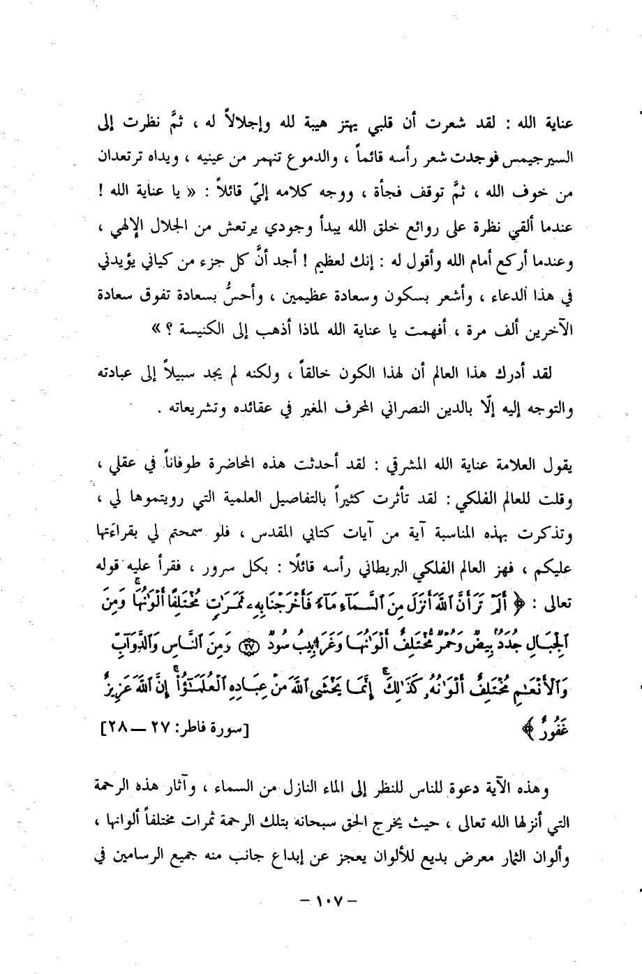 يقول العلامة عناية الله المشرقي: لقد أحدثت هذه المحاضرة طوفانًا في عقلي، وقلت للعالم الفلكي: لقد تأثرت كثيرًا بالتفاصيل العلمية التي رويتموها لي، وتذكرت بهذه المناسبة آية من آيات كتابي المقدس، فلو سمحتم لي بقراءَتها عليكم، فهز العالم الفلكي البريطاني رأسه قائلًا: بكل سرور، فقرأ عليه قوله تعالى: {أَلَمْ تَرَ أَنَّ اللَّهَ أَنْزَلَ مِنَ السَّمَاءِ مَاءً فَأَخْرَجْنَا بِهِ ثَمَرَاتٍ مُخْتَلِفًا أَلْوَانُهَا وَمِنَ الْجِبَالِ جُدَدٌ بِيضٌ وَحُمْرٌ مُخْتَلِفٌ أَلْوَانُهَا وَغَرَابِيبُ سُودٌ (27) وَمِنَ النَّاسِ وَالدَّوَابِّ وَالْأَنْعَامِ مُخْتَلِفٌ أَلْوَانُهُ كَذَلِكَ إِنَّمَا يَخْشَى اللَّهَ مِنْ عِبَادِهِ الْعُلَمَاءُ إِنَّ اللَّهَ عَزِيزٌ غَفُورٌ} [فاطر: 27، 28].