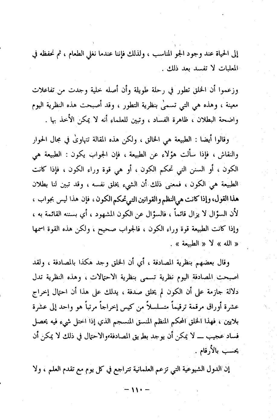 وقالوا أيضًا: الطبيعة هي الخالق، ولكن هذه المقالة تتهاوى في مجال الحوار والنقاش، فإذا سألت هؤلاء عن الطبيعة، فإن الجواب يكون: الطبيعة هي الكون، أو السنن التي تحكم الكون، أو هي قوة وراء الكون، فإذا كانت الطبيعة هي الكون، فمعنى ذلك أن الشيء يخلق نفسه، وقد تبين لنا بطلان هذا القول، وإذا كانت هي النظم والقوانين التي تحكم الكون، فإن هذا ليس بجواب، لأن السؤال لا يزال قائمًا، فالسؤال عن الكون المشهود، أي بسننه القائمة به، وإذا كانت الطبيعة قوة وراء الكون، فالجواب صحيح، ولكن هذه القوة اسمها "الله" لا "الطبيعة".