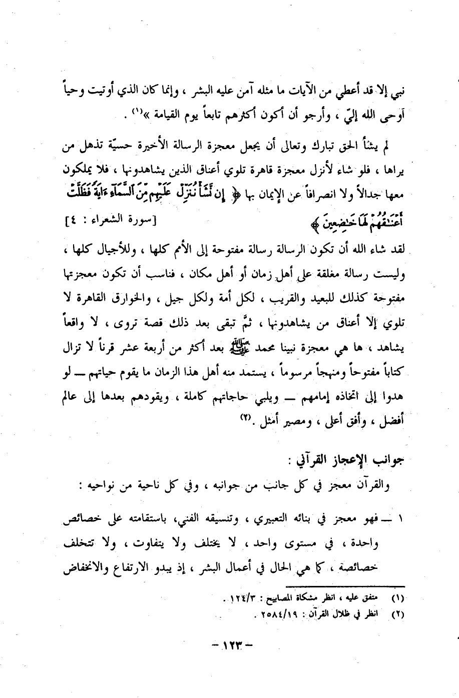 1 - فهو معجز في بنائه التعبيري، وتنسيقه الفني، باستقامته على خصائص واحدة، في مستوى واحد، لا يختلف ولا يتفاوت، ولا تتخلف خصائصة، كما هي الحال في أعمال البشر، إذ يبدو الارتفاع والانخفاض