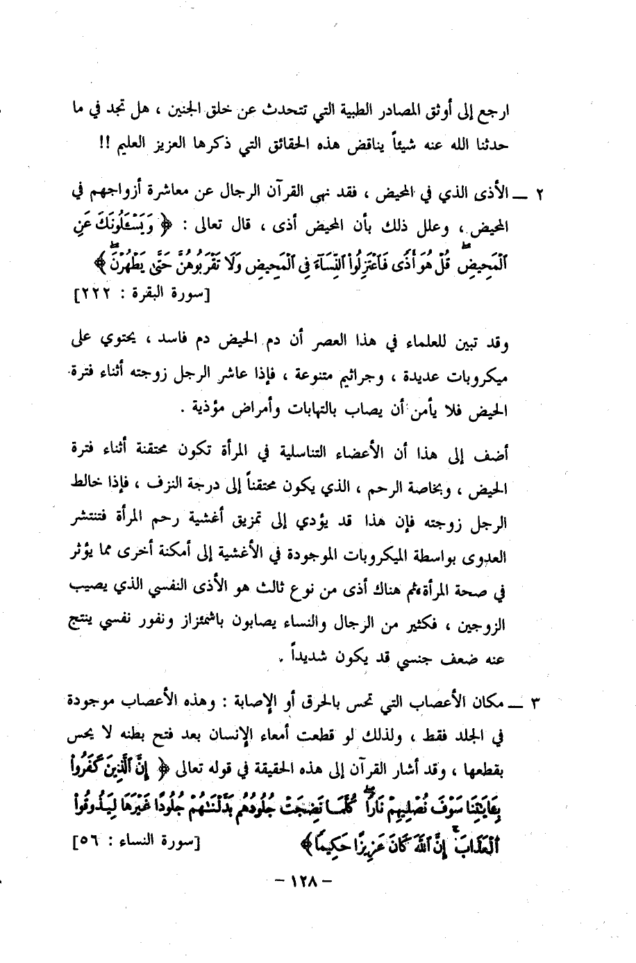 2 - الأذى الذي في المحيض، فقد نهى القرآن الرجال عن معاشرة أزواجهم في المحيض، وعلل ذلك بأن المحيض أذى، قال تعالى: {وَيَسْأَلُونَكَ عَنِ الْمَحِيضِ قُلْ هُوَ أَذًى فَاعْتَزِلُوا النِّسَاءَ فِي الْمَحِيضِ وَلَا تَقْرَبُوهُنَّ حَتَّى يَطْهُرْنَ} [البقرة: 222].