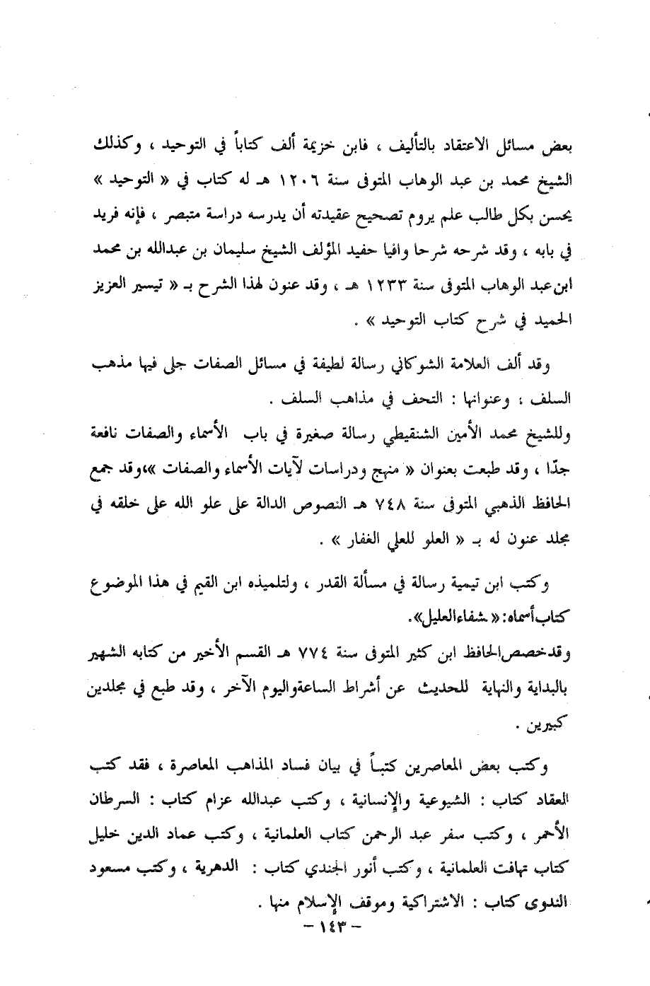 بعض مسائل الاعتقاد بالتأليف، فابن خزيمة ألف كتابًا في التوحيد، وكذلك الشيخ محمد بن عبد الوهاب المتوفى سنة 1206 هـ له كتاب في "التوحيد" يحسن بكل طالب علم يروم تصحيح عقيدته أن يدرسه دراسة متبصر، فإنه فريد في بابه، وقد شرحه شرحا وافيا حفيد المؤلف الشيخ سليمان بن عبد الله بن محمد بن عبد الوهاب المتوفى سنة 1233 هـ، وقد عنون لهذا الشرح بـ "تيسير العزيز الحميد في شرح كتاب التوحيد".