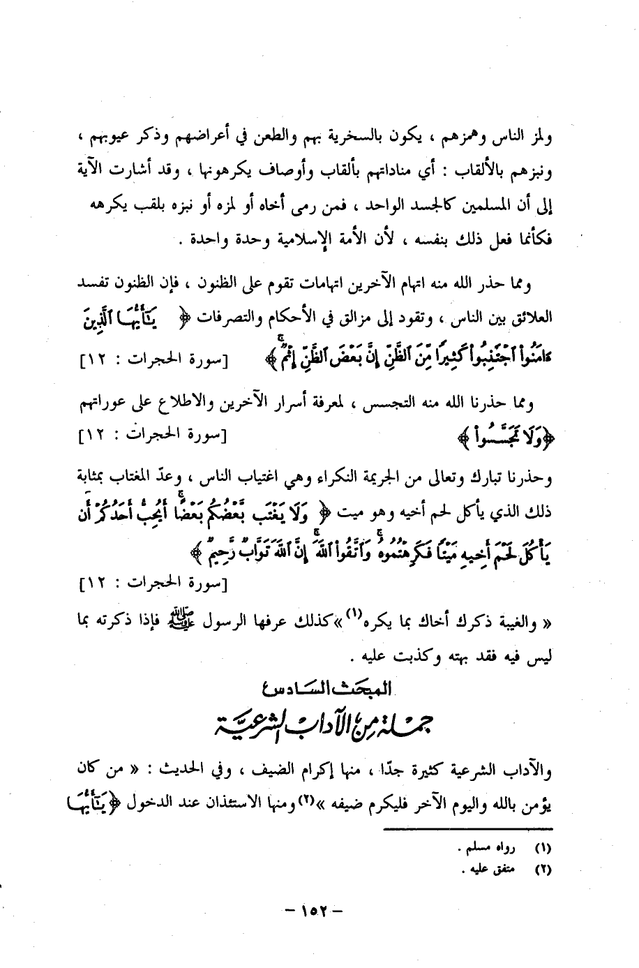وحذرنا تبارك وتعالى من الجريمة النكراء وهي اغتياب الناس، وعدّ المغتاب بمثابة ذلك الذي يأكل لحم أخيه وهو ميت {وَلَا يَغْتَبْ بَعْضُكُمْ بَعْضًا أَيُحِبُّ أَحَدُكُمْ أَنْ يَأْكُلَ لَحْمَ أَخِيهِ مَيتًا فَكَرِهْتُمُوهُ وَاتَّقُوا اللَّهَ إِنَّ اللَّهَ تَوَّابٌ رَحِيمٌ} [الحجرات: 12].