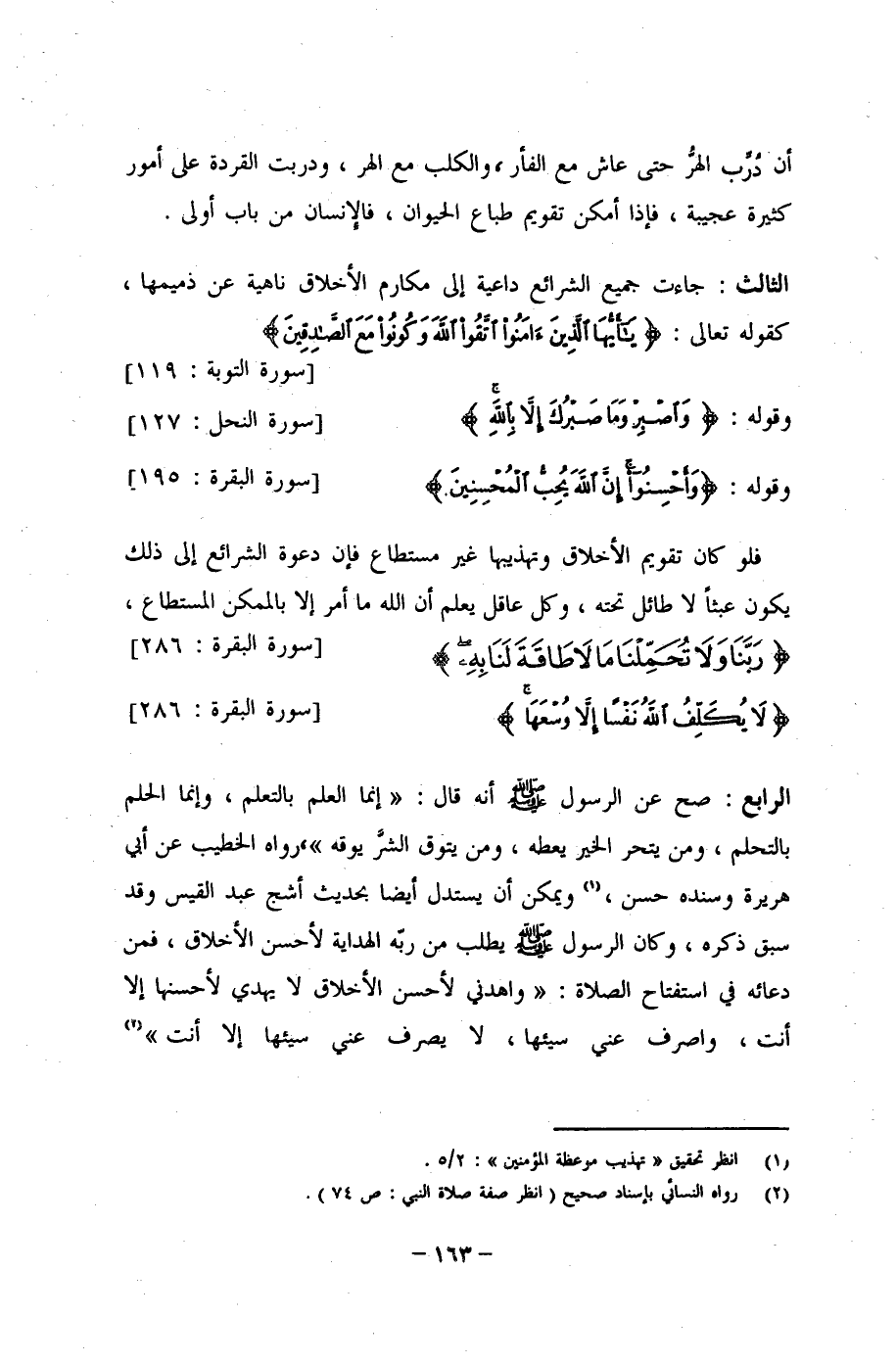 الثالث: جاءت جميع الشرائع داعية إلى مكارم الأخلاق ناهية عن ذميمها، كقوله تعالى: {يَا أَيُّهَا الَّذِينَ آمَنُوا اتَّقُوا اللَّهَ وَكُونُوا مَعَ الصَّادِقِينَ} [التوبة: 119].