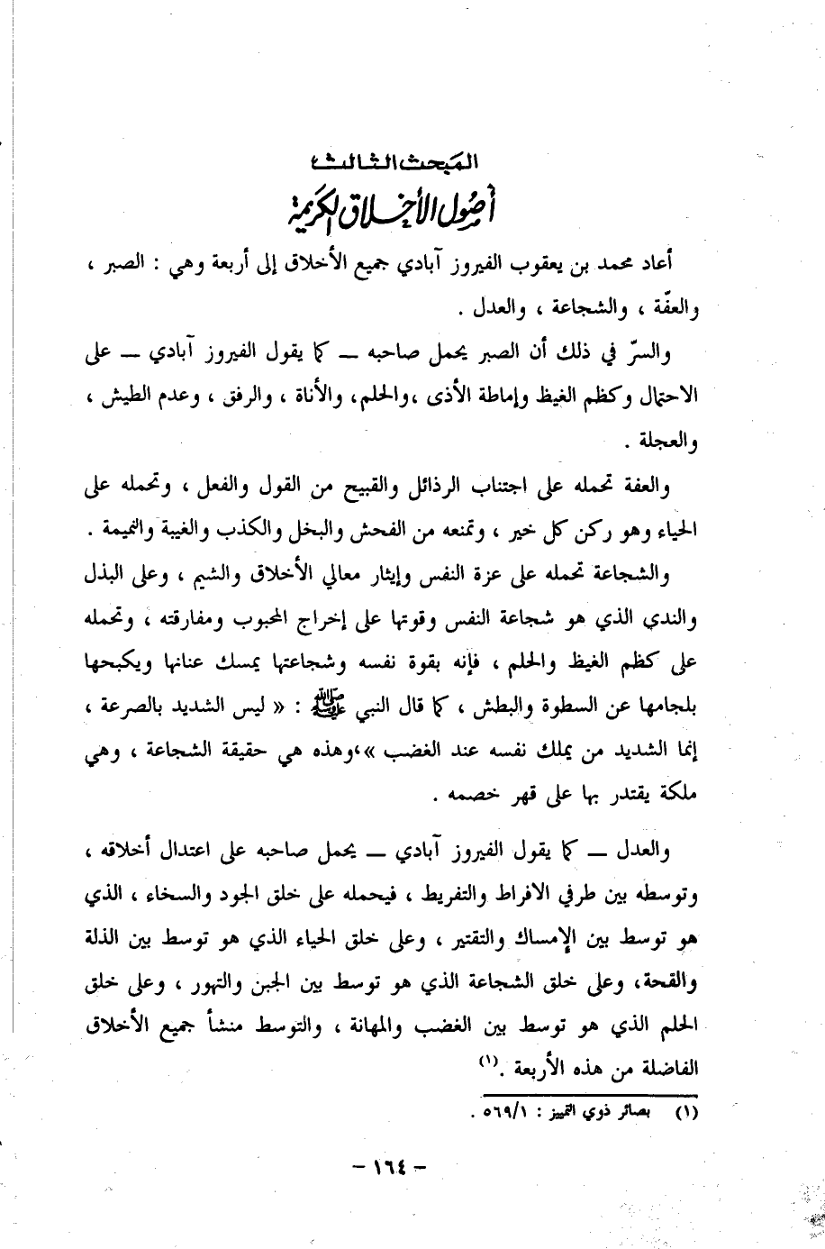 أعاد محمد بن يعقوب الفيروز آبادي جميع الأخلاق إلى أربعة وهي: الصبر، والعفّة، والشجاعة، والعدل.