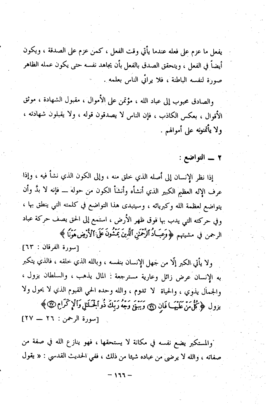 إذا نظر الإنسان إلى أصله الذي خلق منه، وإلى الكون الذي نشأ فيه، وإذا عرف الإله العظيم الكبير الذي أنشأه وأنشأ الكون من حوله - فإنه لا بدَّ وأن يتواضع لعظمة الله وكبريائه، وسيتبدى هذا التواضع في كلمته التي ينطق بها، وفي حركته التي يدب بها فوق ظهر الأرض، استمع إلى الحق يصف حركة عباد الرحمن في مشيتهم {وَعِبَادُ الرَّحْمَنِ الَّذِينَ يَمْشُونَ عَلَى الْأَرْضِ هَوْنًا} [الفرقان: 63].