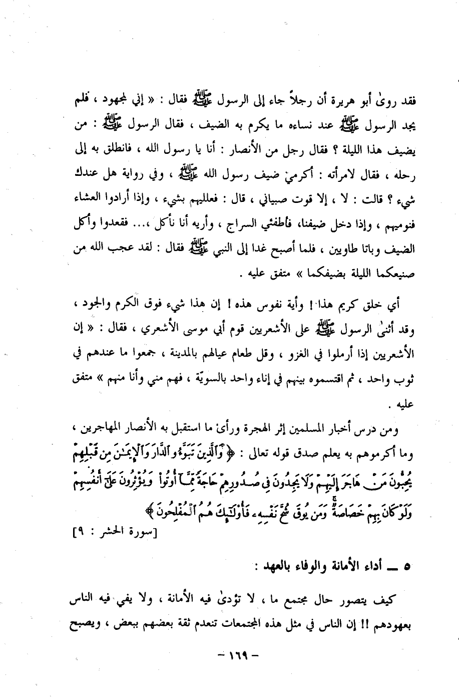 أي خلق كريم هذا! وأية نفوس هذه! إن هذا شيء فوق الكرم والجود، وقد أثنى الرسول - صلى الله عليه وسلم - على الأشعريين قوم أبي موسى الأشعري، فقال: "إن الأشعريين إذا أرملوا في الغزو، وقل طعام عيالهم بالمدينة، جمعوا ما عندهم في ثوب واحد، ثم اقتسموه بينهم في إناء واحد بالسويّة، فهم مني وأنا منهم" متفق عليه.
