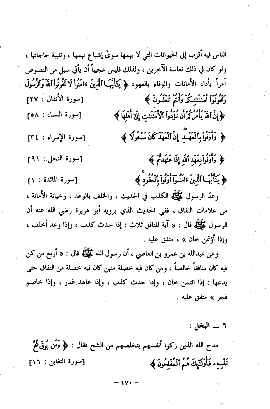 الناس فيه أقرب إلى الحيوانات التي لا يهمها سوى إشباع نهمها، وتلبية حاجاتها، ولو كان في ذلك تعاسة الآخرين، ولذلك فليس عجيبًا أن يأتي سيل من النصوص آمرًا بأداء الأمانات والوفاء بالعهود {يَا أَيُّهَا الَّذِينَ آمَنُوا لَا تَخُونُوا اللَّهَ وَالرَّسُولَ وَتَخُونُوا أَمَانَاتِكُمْ وَأَنْتُمْ تَعْلَمُونَ} [الأنفال: 27].