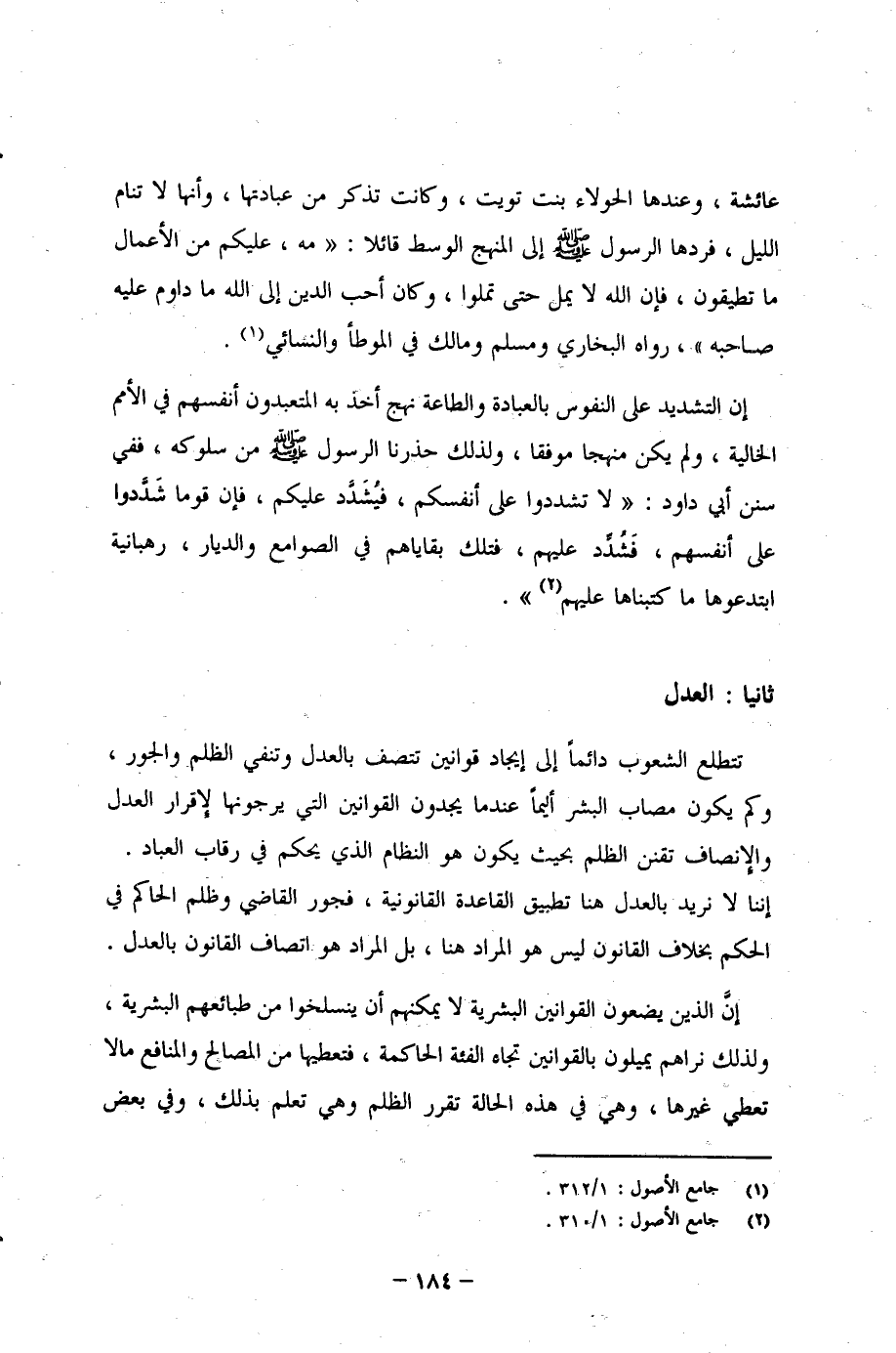 عائشة، وعندها الحولاء بنت تويت، وكانت تذكر من عبادتها، وأنها لا تنام الليل، فردها الرسول - صلى الله عليه وسلم - إلى المنهج الوسط قائلا: "مه، عليكم من الأعمال ما تطيقون، فإن الله لا يمل حتى تملوا، وكان أحب الدين إلى الله ما داوم عليه صاحبه"، رواه البخاري ومسلم ومالك في الموطأ والنسائي (¬1).