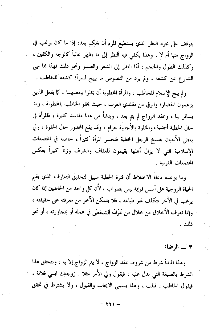 يتوقف على مجرد النظر الذي يستطيع المرء أن يحكم بعده إذا ما كان يرغب في الزواج منها أم لا، وهذا يكفي فيه النظر إلى ما يظهر غالبًا كالوجه والكفين، وكذلك الطول والحجم، أمّا النظر إلى الشعر والصدر ونحو ذلك فهذا مما نهى الشارع عن كشفه، ولم يرد من النصوص ما يبيح للمرأة كشفه للخاطب.