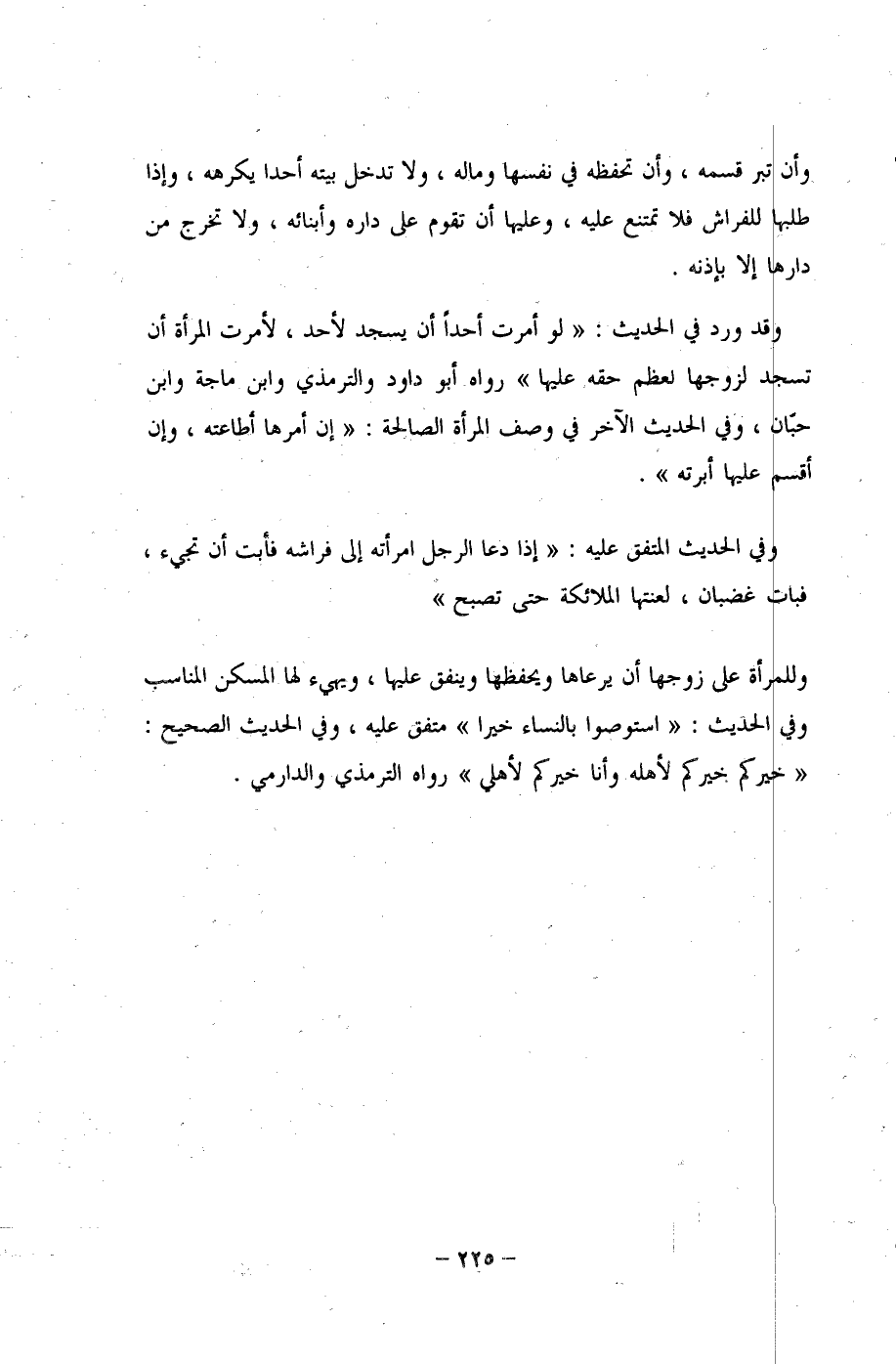 وقد ورد في الحديث: "لو أمرت أحدًا أن يسجد لأحد، لأمرت المرأة أن تسجد لزوجها لعظم حقه عليها" رواه أبو داود والترمذي وابن ماجة وابن حبان، وفي الحديث الآخر في وصف المرأة الصالحة: "إن أمرها أطاعته، وإن أقسم عليها أبرته".