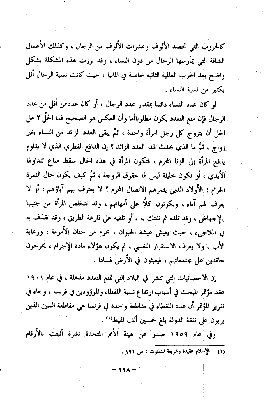لو كان عدد النساء دائما بمقدار عدد الرجال، أو كان عددهن أقل من عدد الرجال فإن منع التعدد يكون مطلوبًا أما وأن العكس هو الصحيح فما الحلّ؟ هل الحل أن يتزوج كل رجل امرأة واحدة، ثمَّ يبقى العدد الزائد من النساء بغير زواج، ثمَّ ما الذي يحدث لهذا العدد الزائد؟ إن الدافع الفطري الذي لا يقاوم يدفع المرأة إلى الزنا المحرم، فتكون المرأة في هذه الحال سقط متاع تتداولها الأيدي، أو تكون خليلة ليس لها حقوق الزوجة، ثمَّ كيف يكون حال الثمرة الحرام: الأولاد الذين يثمرهم الاتصال المحرم؟ لا يعترف بهم آباؤهم، أو لا يعرف لهم آباء، ويكونون كلًّا على أمهاتهم، وقد تتخلص المرأة من جنينها بالإجهاض، وقد تلده ثم تفتك به، أو تلقيه على قارعة الطريق، وقد تقذف به في الملاجئ، حيث يعيش عيشة الحيوان، يحرم من حنان الأمومة، ورعاية الأب، ولا يعرف الاستقرار النفسي، ثم يكون هؤلاء مادة الإجرام، يخرجون حاقدين على مجتمعاتهم، فيعيثون في الأرض فسادًا.