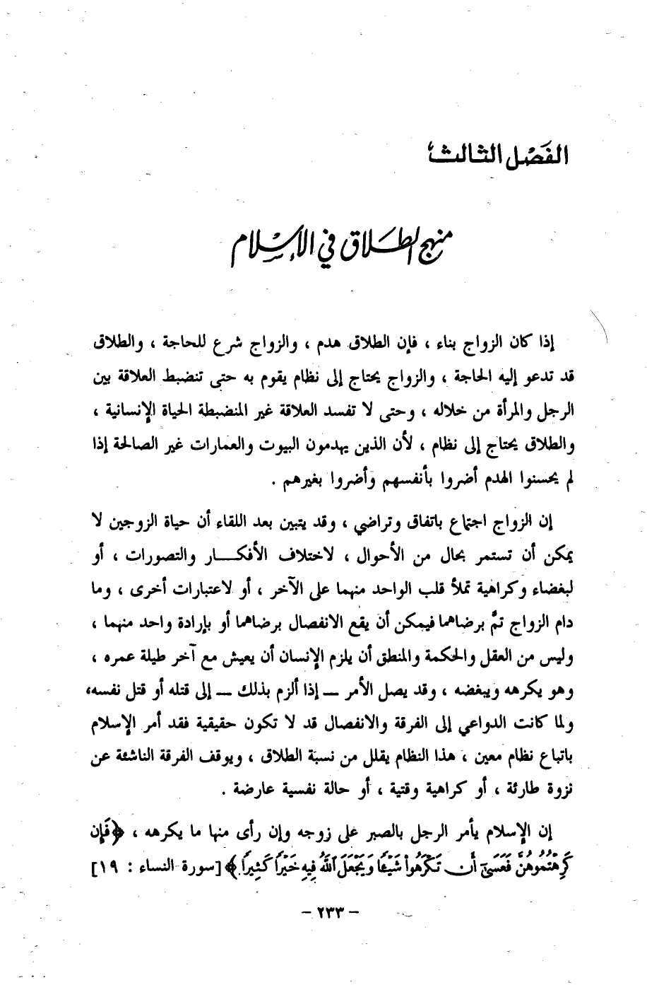 إن الزواج اجتماع باتفاق وتراضي، وقد يتعين بعد اللقاء أن حياة الزوجين لا يمكن أن تستمر بحال من الأحوال، لاختلاف الأفكار والتصورات، أو لبغضاء وكراهيه تملأ قلب الواحد منهما على الآخر، أو لاعتبارات أخرى، وما دام الزواج تمَّ برضاهما فيمكن أن يقع الانفصال برضاهما أو بإرادة واحد منهما، وليس من العقل والحكمة والمنطق أن يلزم الإنسان أن يعيش مع آخر طيلة عمره، وهو يكرهه ويبغضه، وقد يصل الأمر -إذا ألزم بذلك- إلى قتله أو قتل نفسه ولما كانت الدواعي إلى الفرقة والانفصال قد لا تكون حقيقية فقد أمر الإسلام باتباع نظام معين، هذا النظام يقلل من نسبة الطلاق، ويوقف الفرقة الناشئة عن نزوة طارئة، أو كراهية وقتية، أو حالة نفسية عارضة.