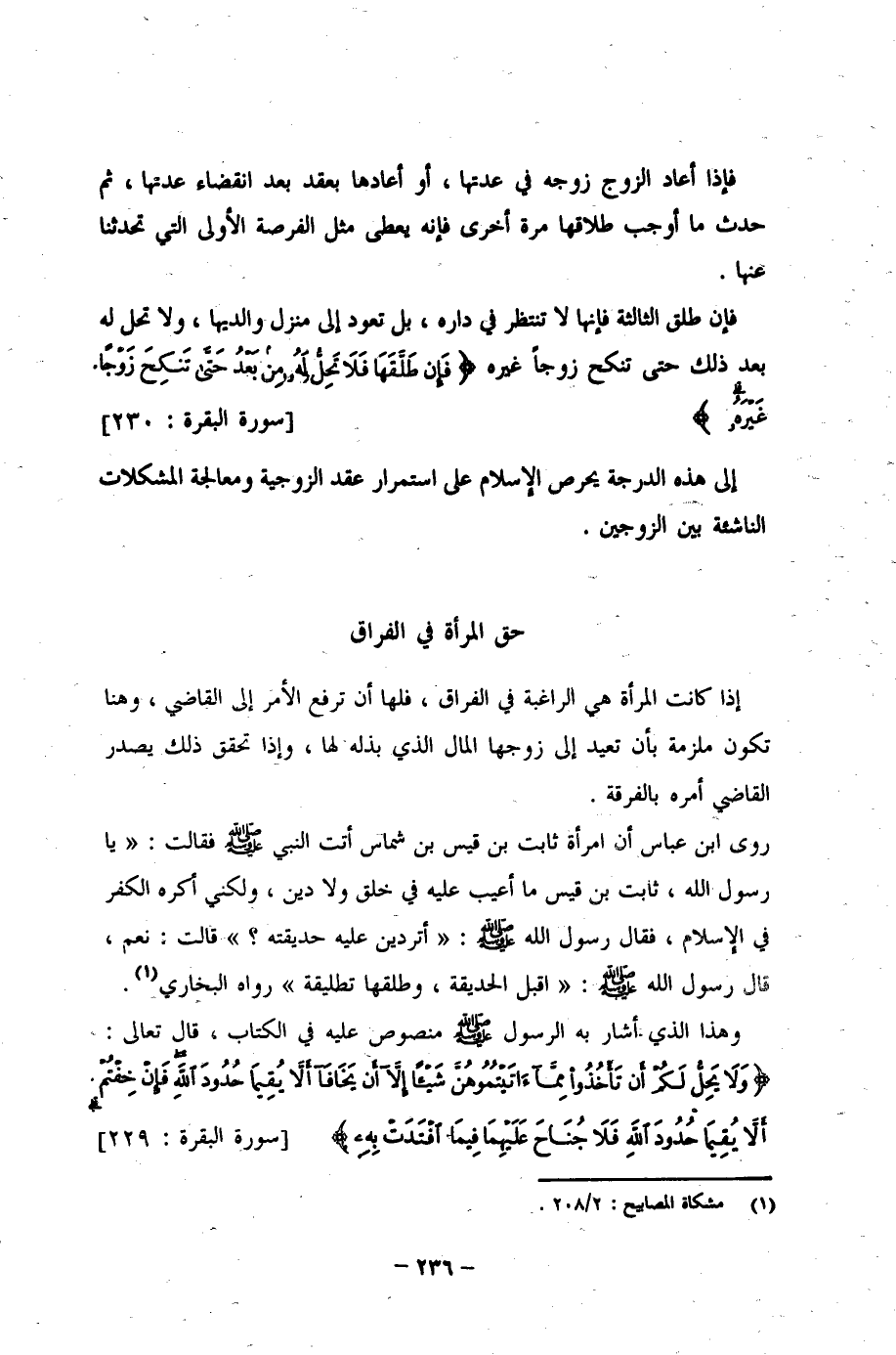 وهذا الذي أشار به الرسول - صلى الله عليه وسلم - منصوص عليه في الكتاب، قال تعالى: {وَلَا يَحِلُّ لَكُمْ أَنْ تَأْخُذُوا مِمَّا آتَيتُمُوهُنَّ شَيئًا إلا أَنْ يَخَافَا أَلَّا يُقِيمَا حُدُودَ اللَّهِ فَإِنْ خِفْتُمْ أَلَّا يُقِيمَا حُدُودَ اللَّهِ فَلَا جُنَاحَ عَلَيهِمَا فِيمَا افْتَدَتْ بِهِ} [البقرة: 229].