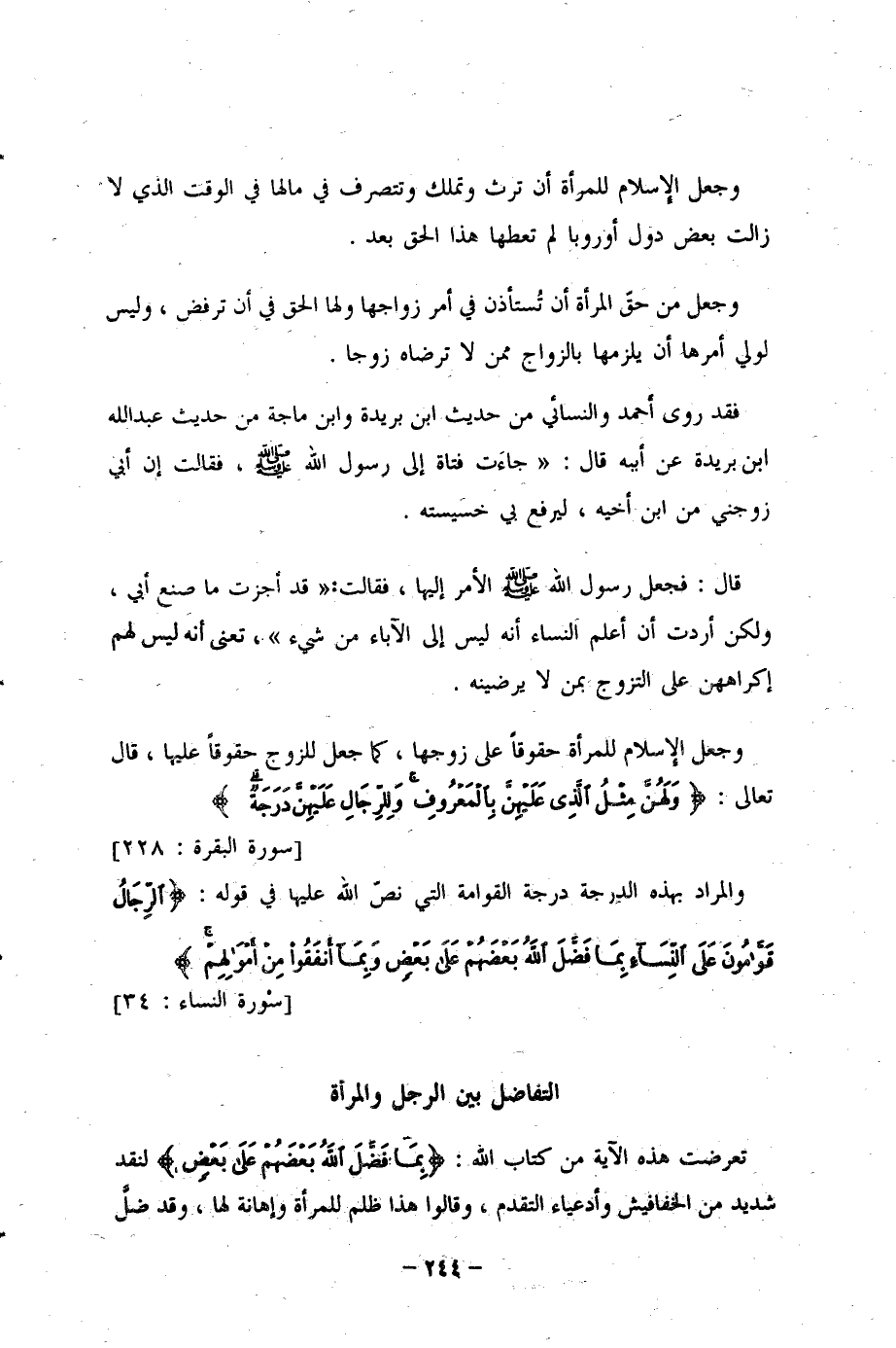وجعل الإسلام للمرأة حقوقًا علي زوجها، كما للزوج حقوقًا عليها، قال {وَلَهُنَّ مِثْلُ الَّذِي عَلَيهِنَّ بِالْمَعْرُوفِ وَلِلرِّجَالِ عَلَيهِنَّ دَرَجَةٌ} [البقرة: 228].