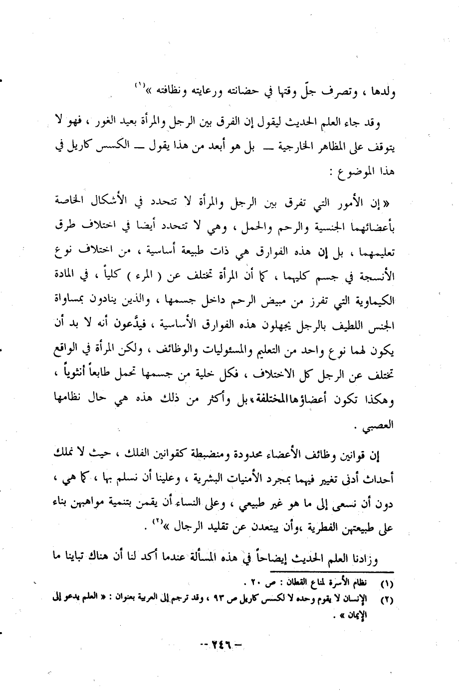 وقد جاء العلم الحديث ليقول إن الفرق بين الرجل والمرأة بعيد الغور، فهو لا يتوقف على المظاهر الخارجية -بل هو أبعد من هذا يقول- الكس كاريل في هذا الموضوع: