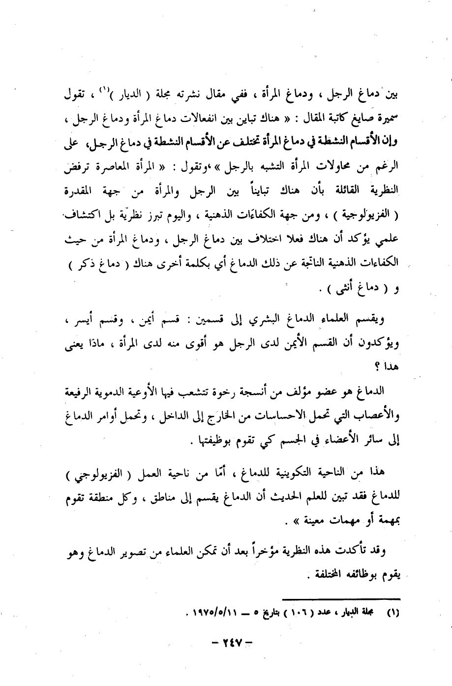 بين دماغ الرجل، ودماغ المرأة، ففي مقال نشرته مجلة (الديار) (¬1)، تقول سميرة صايغ كاتبة المقال: "هناك تباين بين انفعالات دماغ المرأة ودماغ الرجل، وإن الأقسام النشطة في دماغ المرأة تختلف عن الأقسام النشطة في دماغ الرجل، على الرغم من محاولات المرأة التشبه بالرجل"، وتقول: "المرأة المعاصرة ترفض النظرية القائلة بأن هناك تباينًا بين الرجل والمرأة من جهة المقدرة (الفزيولوجية)، ومن جهة الكفاءَات الذهنية، واليوم تبرز نظرية بل اكتشاف علمي يؤكد أن هناك فعلا اختلاف بين دماغ الرجل، ودماغ المرأة من حيث الكفاءات الذهنية الناتجة عن ذلك الدماغ أي بكلمة أخرى هناك (دماغ ذكر) و (دماغ أنثى).