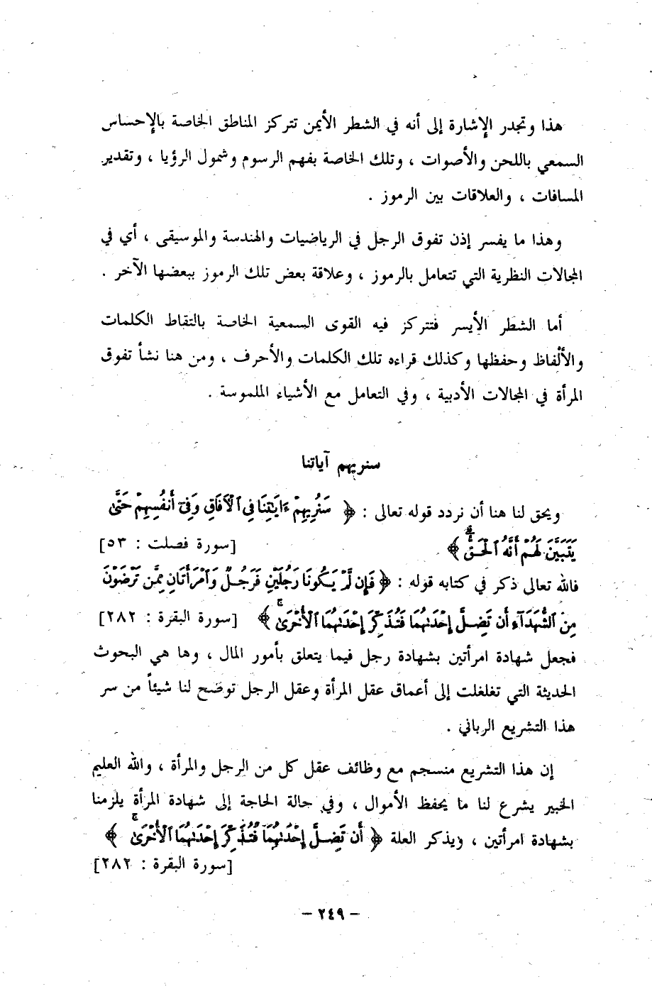 وهذا ما يفسر إذن تفوق الرجل في الرياضيات والهندسة والموسيقى، أي في المجالات النظرية التي تتعامل بالرموز، وعلاقة بعض تلك الرموز ببعضها الآخر.