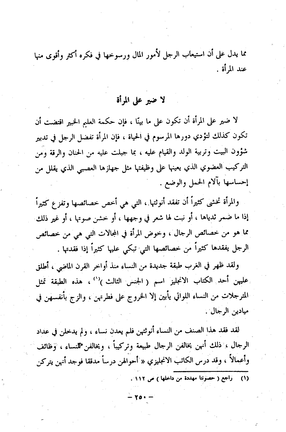 لقد فقد هذا الصنف من النساء أنوثتهن فلم يعدن نساء، ولم يدخلن في عداد الرجال، ذلك أنهن يخالفن الرجال طبيعة وتركيبًا، ويخالفن للنساء، وظائف وأعمالًا، وقد درس الكاتب الإنجليزي "أحوالهن درسًا مدققا فوجد أنهن يتركن