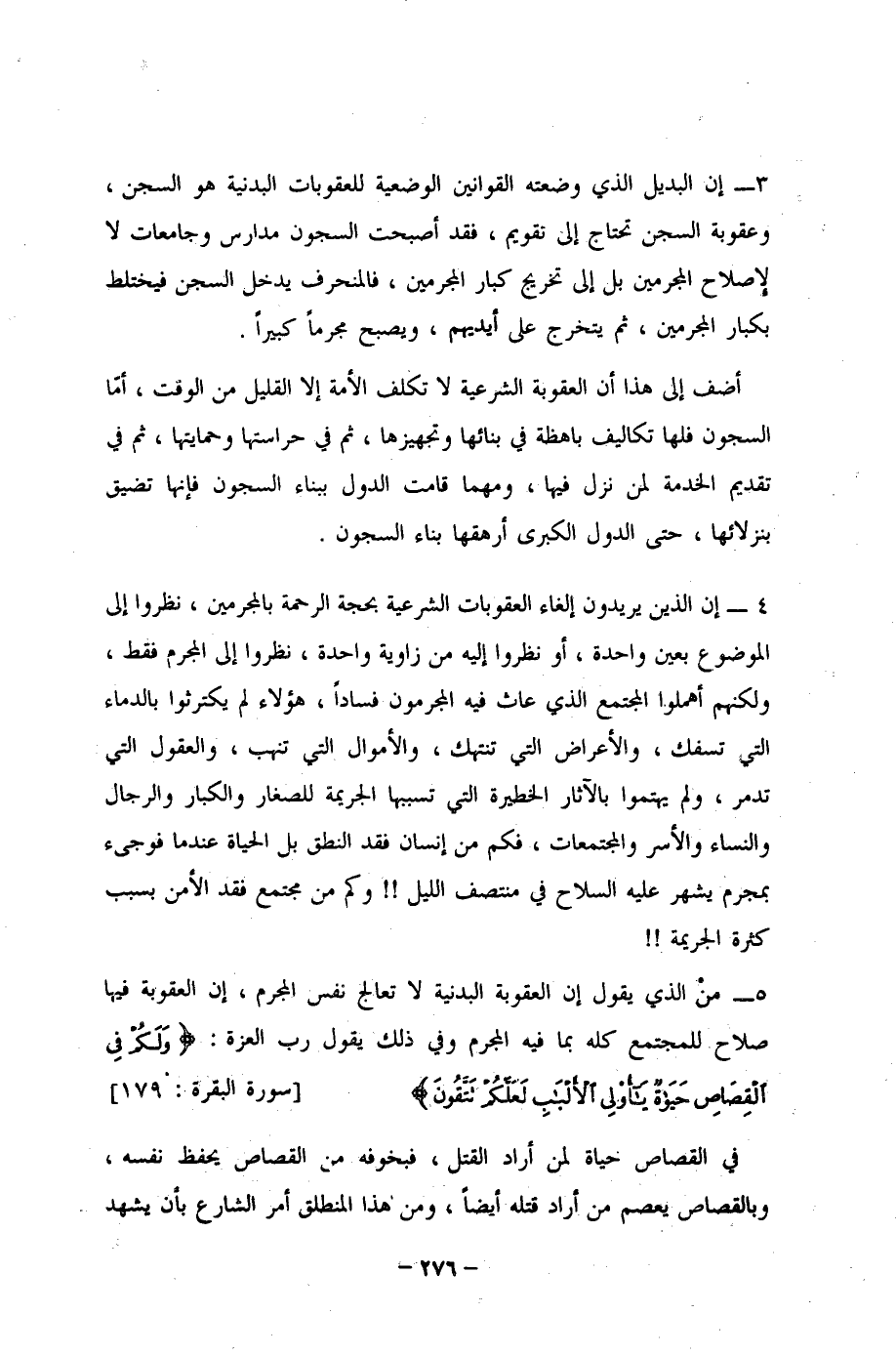 5 - من الذي يقول إن العقوبة البدنية لا تعالج نفس المجرم، إن العقوبة فيها صلاح للمجتمع كله بما فيه المجرم وفي ذلك يقول رب العزة {وَلَكُمْ فِي الْقِصَاصِ حَيَاةٌ يَاأُولِي الْأَلْبَابِ لَعَلَّكُمْ تَتَّقُونَ (179)} [سورة البقرة: 179].