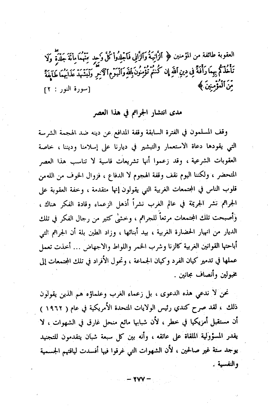 وقف المسلمون في الفترة السابقة وقفة المدافع عن دينه ضد الهجمة الشرسة التي يقودها دعاة الاستعمار والتبشير في ديارنا على إسلامنا وديننا، خاصة العقوبات الشرعية، وقد زعموا أنها تشريعات قاسية لا تناسب هذا العصر المتحضر، ولكننا اليوم نقف وقفة الهجوم لا الدفاع، فزوال الخوف من الله من قلوب الناس في المجتمعات الغربية التي يقولون إنها متقدمة، وخفة العقوبة على الجرائم نشر الجريمة في عالم الغرب نشرًا أذهل الزعماء وقادة الفكر هناك، وأصبحت تلك المجتمعات مرتعًا للجرام، وخشى كثير من رجال الفكر في تلك الديار من انهيار الحضارة الغربية، بيد أبنائها، وزاد الطين بلة أن الجرائم التي أباحتها القوانين الغربية كالزنا وشرب الخمر واللواط والإجهاض ... أخذت تعمل عملها في تدمير كيان الفرد وكيان الجماعة، وتحول الأفراد في تلك المجتمعات إلى مخبولين وأنصاف مجانين.